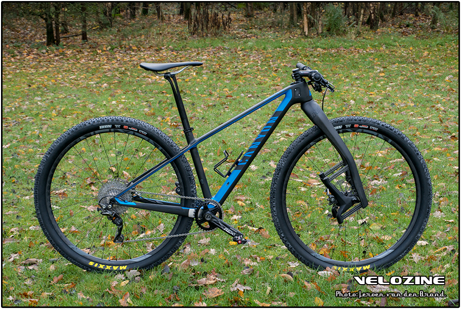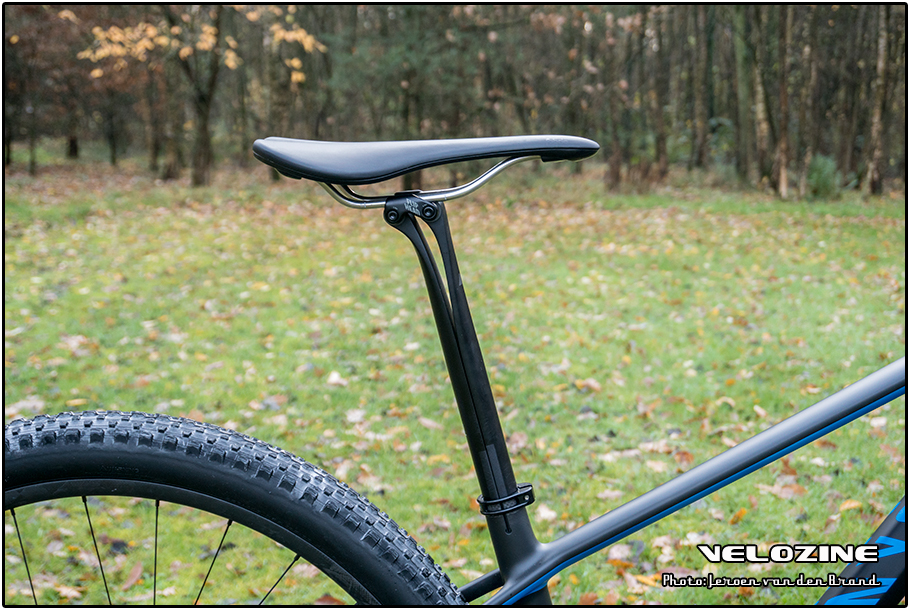 Om de Lauf en VCLS zadelpen te testen, stelde Canyon een Exceed CF SL 29-er frame ter beschikking. De CF SL is het iets zwaardere broertje van de duurdere CF SLX. Waar de CF SLX zich met het haast bizarre framegewicht van 870 gram kan nestelen in de smalle top van sub-1-kg hardtail frames, komt de CF SL ook bij die top aankloppen. Dat ‘iets zwaarder’ moet je namelijk met een korreltje zout, of letterlijk een laagje carbon, nemen: Deze CF SL weegt in de maat ‘S’ 1050 gram, inclusief de zadelpenstrop!