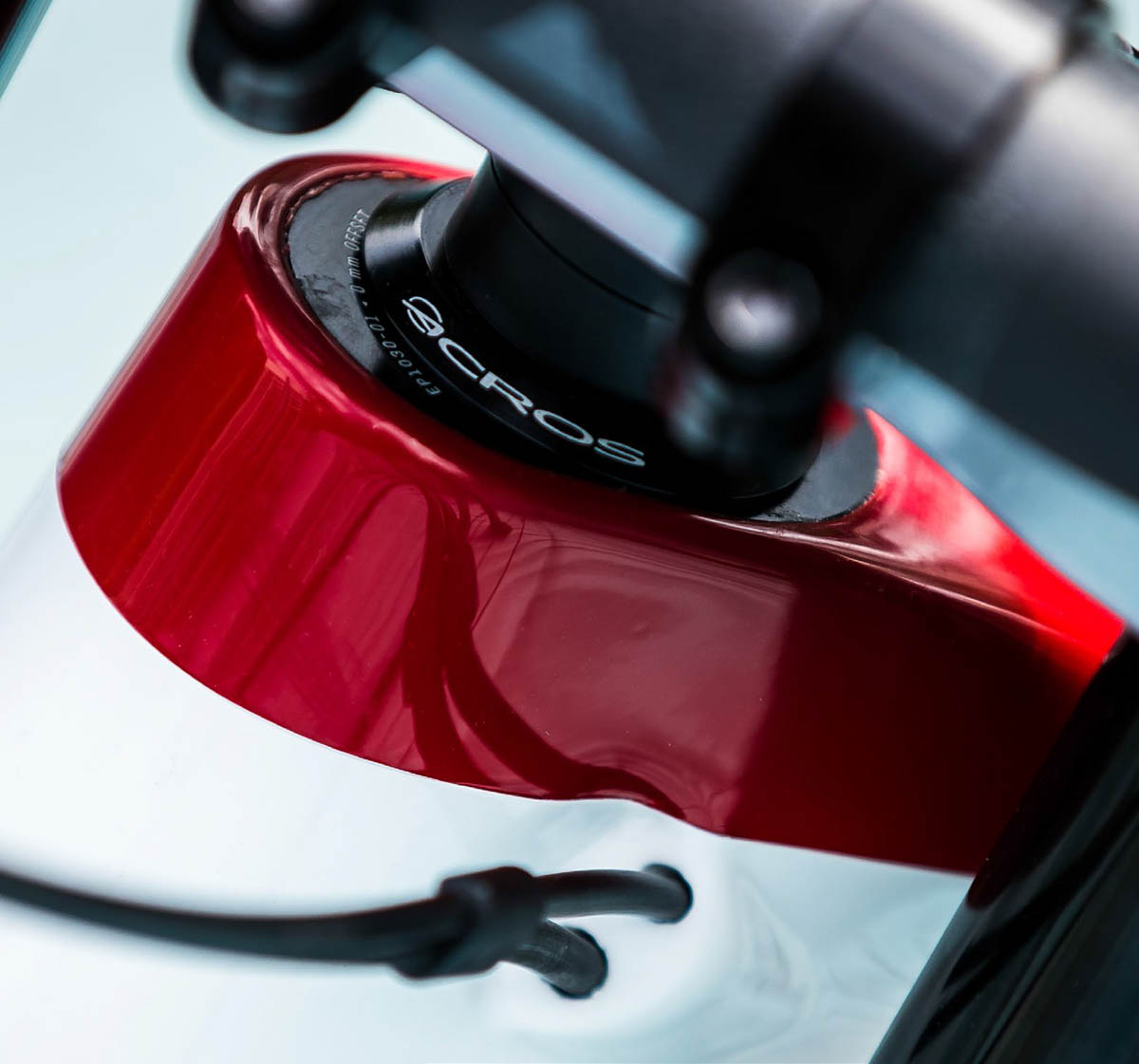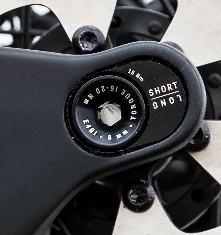 De balhoofdhoek is met 63° ongewijzigd. Wél kun je de voorvork 8 mm horizontaal verplaatsen door een excentrische insert in de balhoofdbuis. Je verandert dus niet de hoek, maar wél de lengte van de gehele fiets én dus de reach. Om daar op te anticiperen is de zitbuishoek ook wat steiler gemaakt. Maar aangezien je vooral zult staan op de pedalen, zul je hier verder weinig van merken.