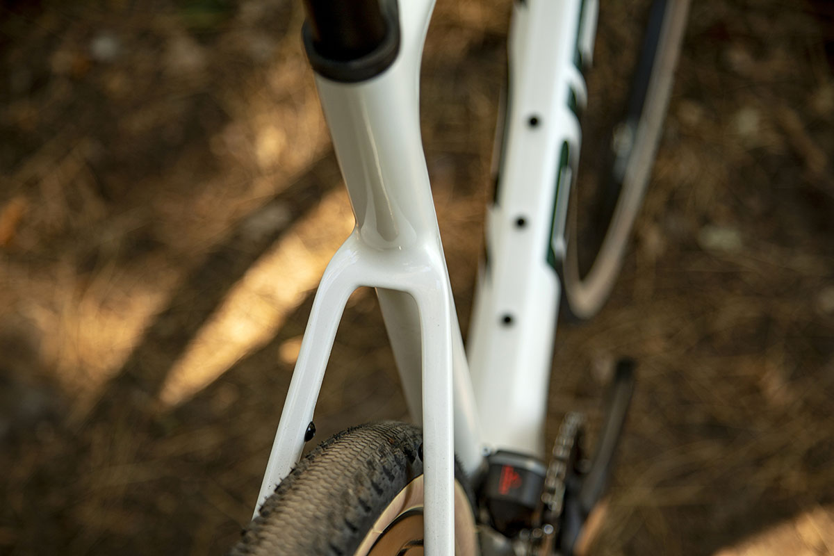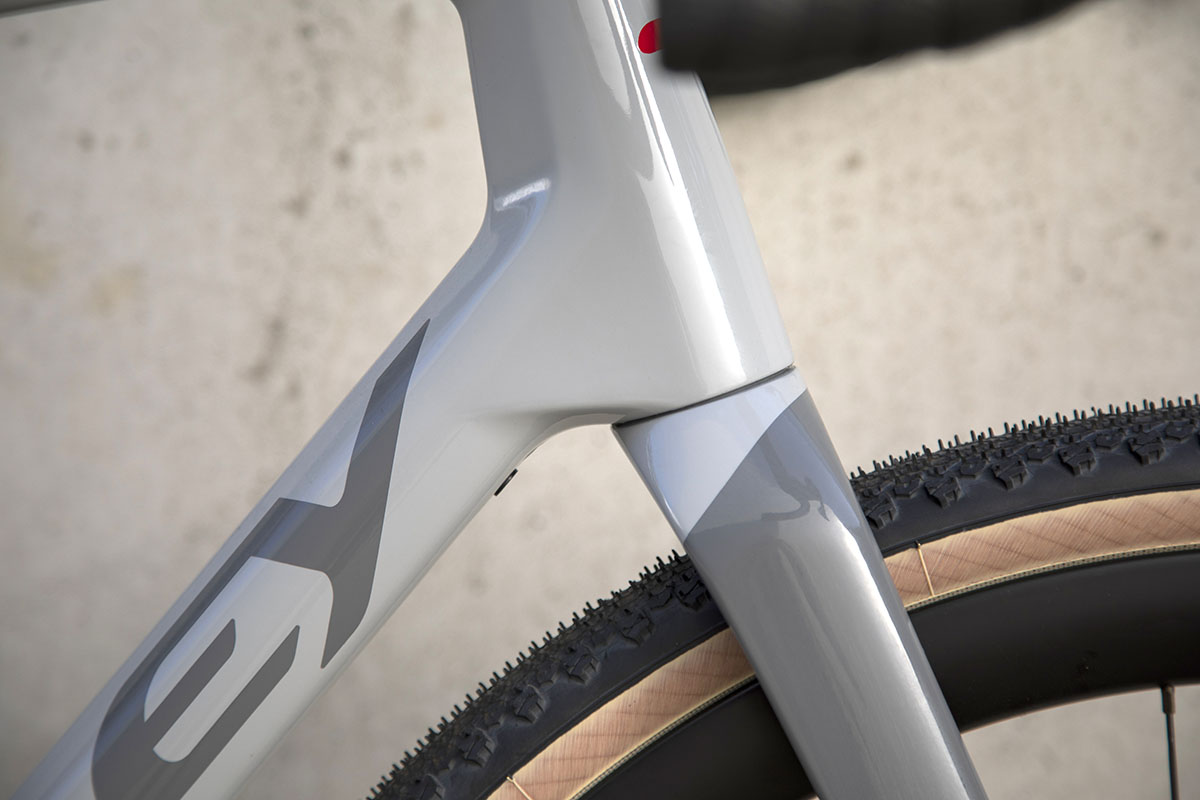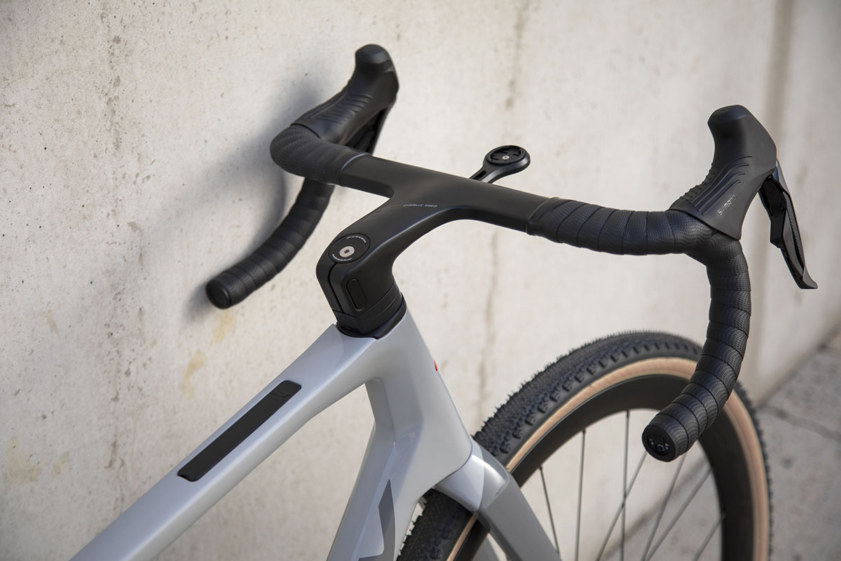 Zowel frame als voorvork zijn volledig uit carbon, waar Ridley een framegewicht opgeeft van 990 gram voor een ongelakt exemplaar in de maat M. Het frame is rondom voorzien van diverse montagepunten voor bidons, dragers en spatborden. Verder vindt je vooraan op de Grifn Ridley’s geïntegreerde F-steerer technologie, waar kabels via de stuurpen en door het bovenste balhoofdlager het frame in gaan. Standaard levert Ridley deze allroad-bike uit met z’n eigen label Cirrus Pro Flared stuur, met een compacte drop van 120 mm, korte reach van 70 mm en een flare van 16º. Tot slot is het vermeldenswaardig dat de Grifn klaar is voor gebruik met een naafdynamo, waarbij de kabel netjes weggewerkt kan worden in de voorvork. Ook de kabel voor een achterlamp kan dóór het frame.