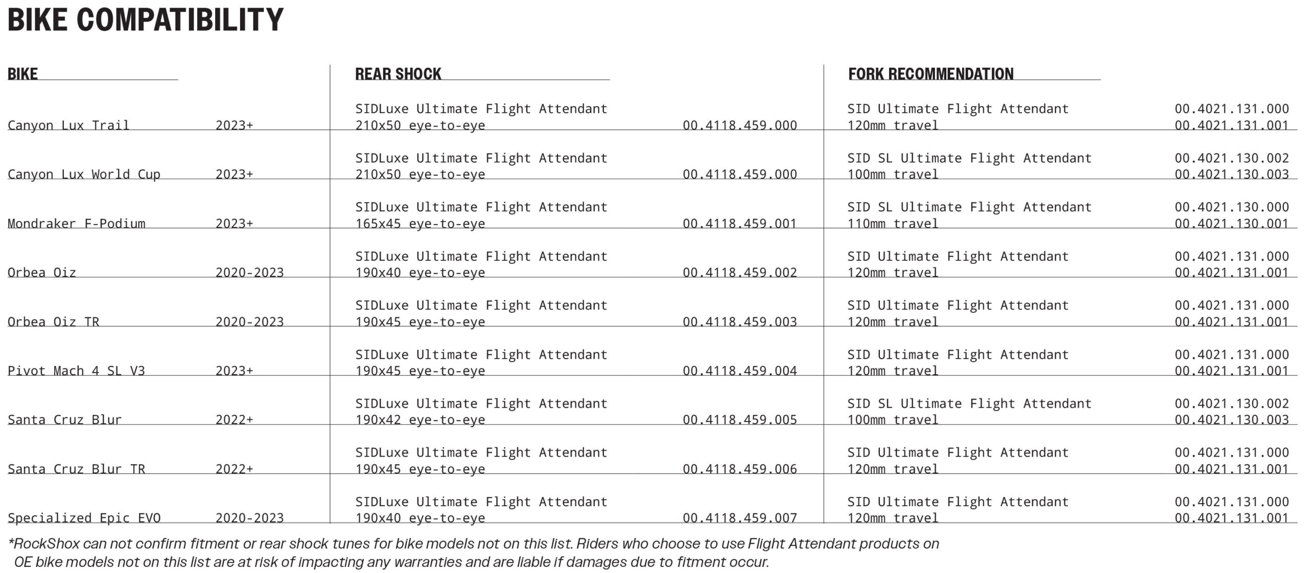 Hoewel je nu ook de Sid en Sid SL, alsook de Sidluxe met Flight Attendant los kunt kopen, geeft Rockshox aan dat het systeem alleen voor een aantal specifieke fullsuspensionbikes beschikbaar is. En ja, ook uitsluitend fullsuspsensions; Flight Attendant is niet geschikt voor gebruik op hardtails. Het is nog niet duidelijk of dat in de toekomst nog verandert. De reden voor de exclusiviteit ten aanzien van merk én type bikes zit hem vooral in de dempersettings én montage van de achterdempers. Daarbij ook rekening houdend met de ruimte die de controlemodule op de achterdemper inneemt ten opzichte van het frame en bijvoorbeeld bidons, zodat dat ook geen problemen veroorzaakt met framegaranties.