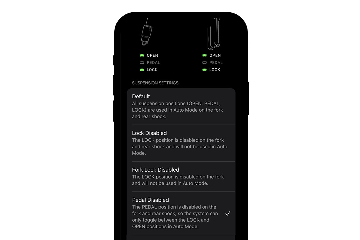 De dempercircuits van de Flight Attendant voorvorken en achterdempers hebben drie standen; open, pedal en lock. In de Auto Mode schakelt het systeem continu tussen die drie standen om je zo optimale grip, comfort en trapefficiëntie te geven. Je kunt altijd handmatig ingrijpen en een stand vastzetten. Via de Sram AXS-app kon je de Auto Mode ook dusdanig instellen dat bijvoorbeeld de voorvork of juist de achterdemper (of beide) nooit volledig geblokkeerd wordt. Bij de laatste update die nu beschikbaar is, kun je er ook voor kiezen om juist de pedal-stand over te slaan. Je kunt het systeem zodoende continu laten schakelen tussen volledig geopende en gesloten dempers.