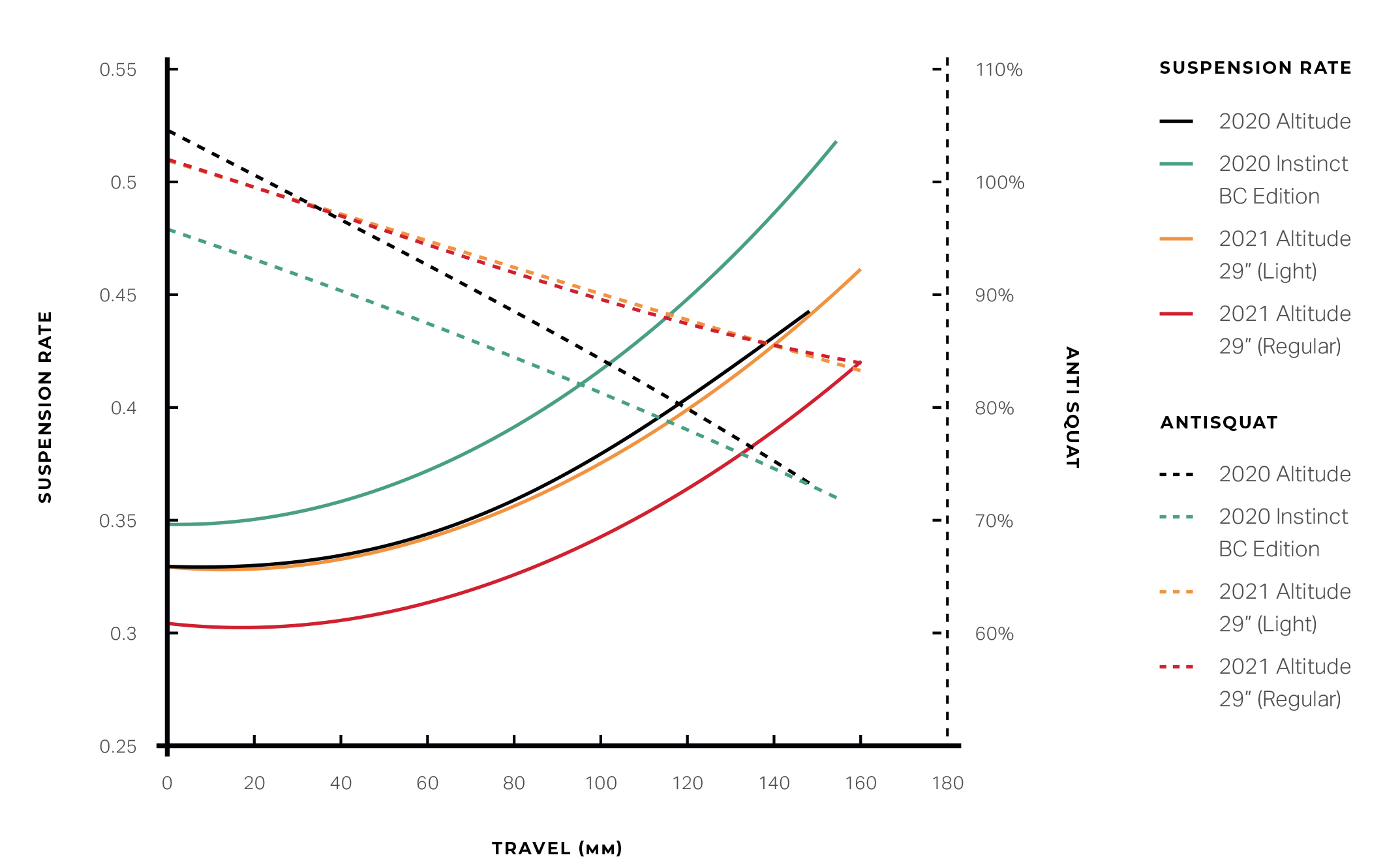 Qua kinematiek zit de Altitude aardig tussen de twee voorgangers in. De veerkromme blijft progressief (en ligt afhankelijk van geo instellingen praktisch op de kromme van de oude Altitude). Hierdoor kan je naast een luchtdemper ook een demper met lineair schroefveer gebruiken. Volgens Rocky Mountain biedt de 2021 veerkromme fijngevoeligere vering in het begin maar voldoende stabiliteit en reserve richting midden en einde veerweg. Interessant detail: de kleinere 27,5″ frame’s gebruiken een 210×55 mm demper voor dezelfde veerweg, terwijl de grotere frame’s een 230×60 mm model nodig hebben.