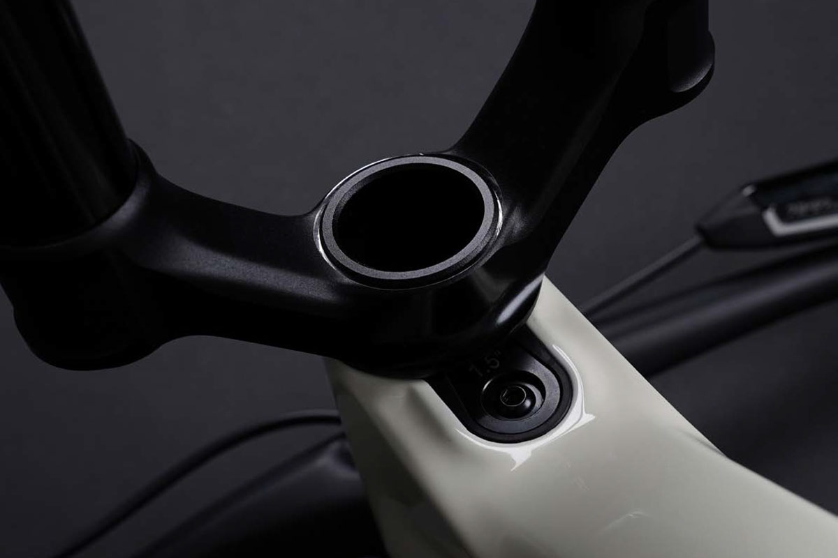 Het frame is gemaakt met Fast AF-carbon. Je mag zelf raden waar die ‘AF’ voor staat. Hoe dan ook; met z’n rechte lijnen oogt het high modulus carbon frame lekker strak. Met 940 gram (framemaat niet opgegeven) is-ie ook concurrerend licht. Je hebt daarbij keuze uit drie verschillende kleuren, ‘oat milk’, ‘borealis’ en ‘stealth black’. En in elk van die gevallen zou Rose wat ons betreft de PDQ óók Pretty And Damn Quick hebben mogen noemen. Maar goed, tot zover onze mening. Al hoewel; Rose omarmt ook de trend voor kabels dóór het bovenste balhoofdlager. En hoe strak en mooi dat er ook uitziet…