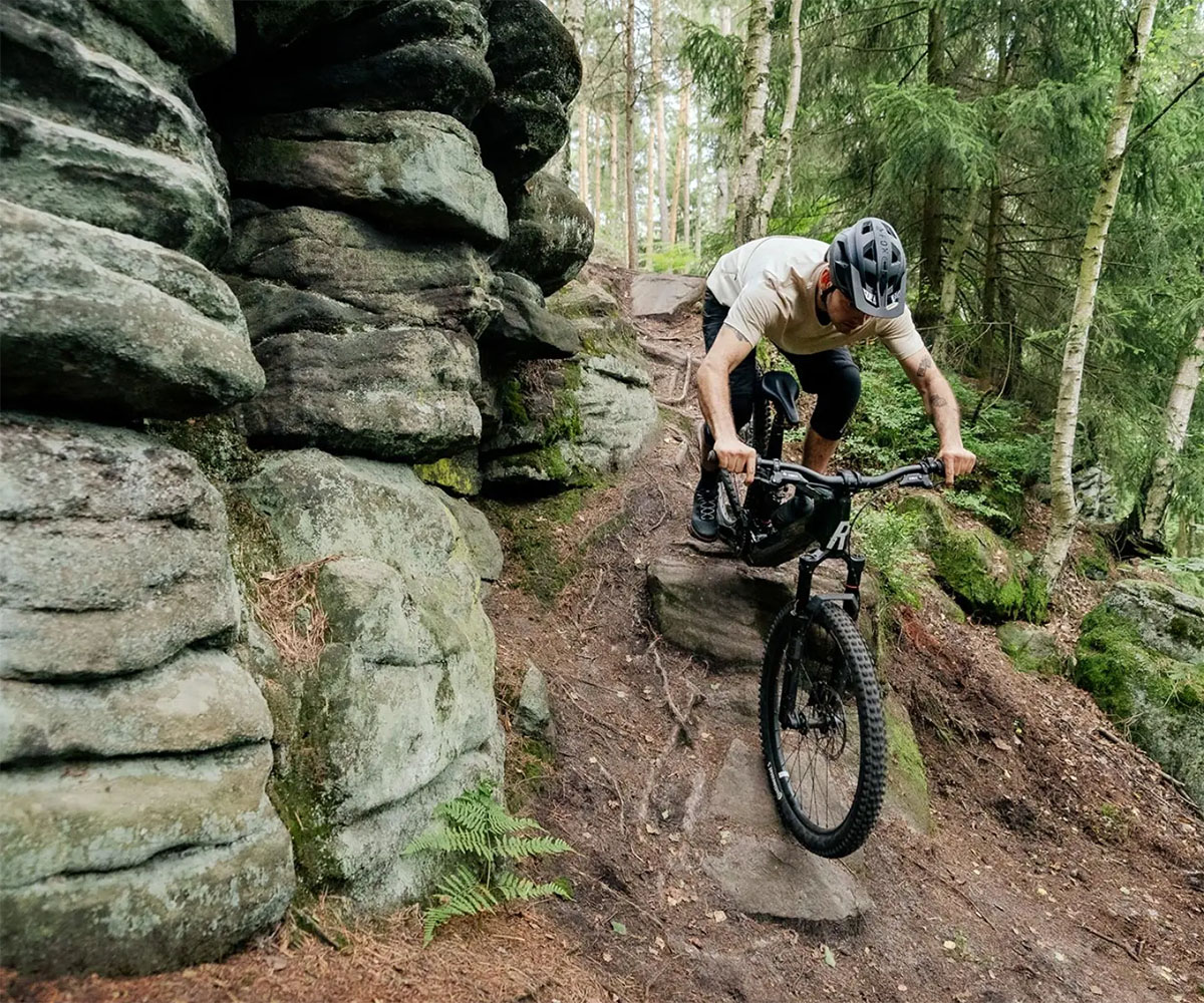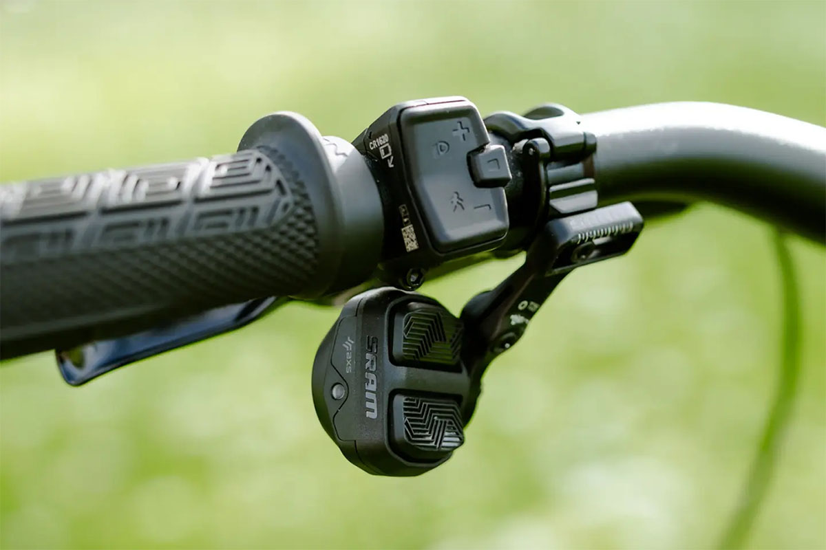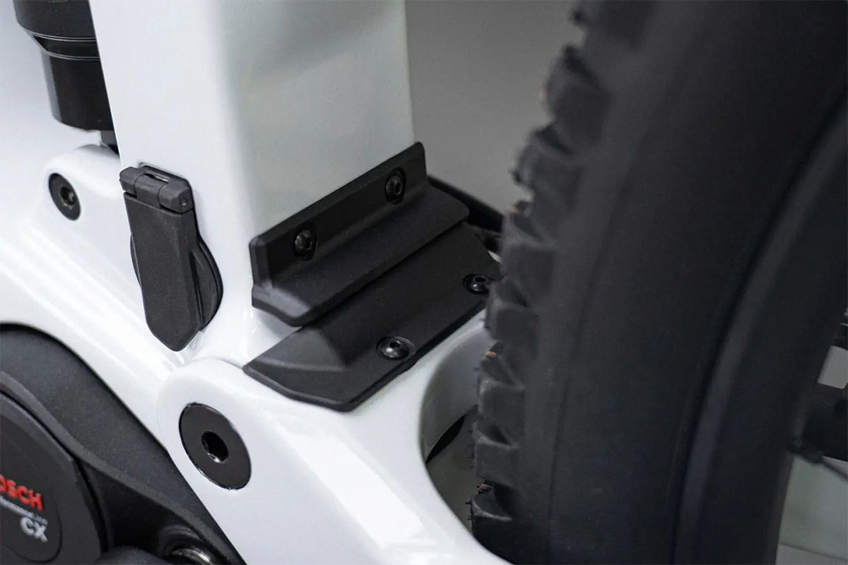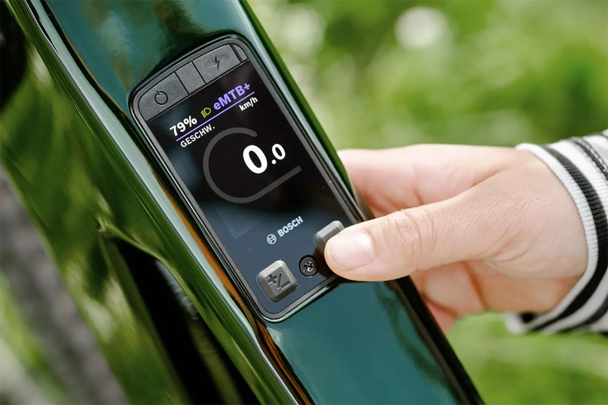 De Slab Plus is opgebouwd rond een volledig carbon frame met een geïntegreerde Bosch Powertube 800 wattuur-accu. Die is niet uitneembaar, maar wordt opgeladen via een poort aan de linkerzijde van de zitbuis. Via die poort is ook de optionele, externe range extender Powermore 250 aan te koppelen. De Bosch CX Gen 5-motor levert tot 600 watt piekvermogen en tot 400 procent trapondersteuning en werkt samen met Bosch’ Smart System-bediening met mini-remote op het stuur. Het instapmodel maakt gebruik van de Bosch System Controller in de bovenbuis, terwijl de andere twee modellen met het Kiox 400C-display zijn uitgevoerd.