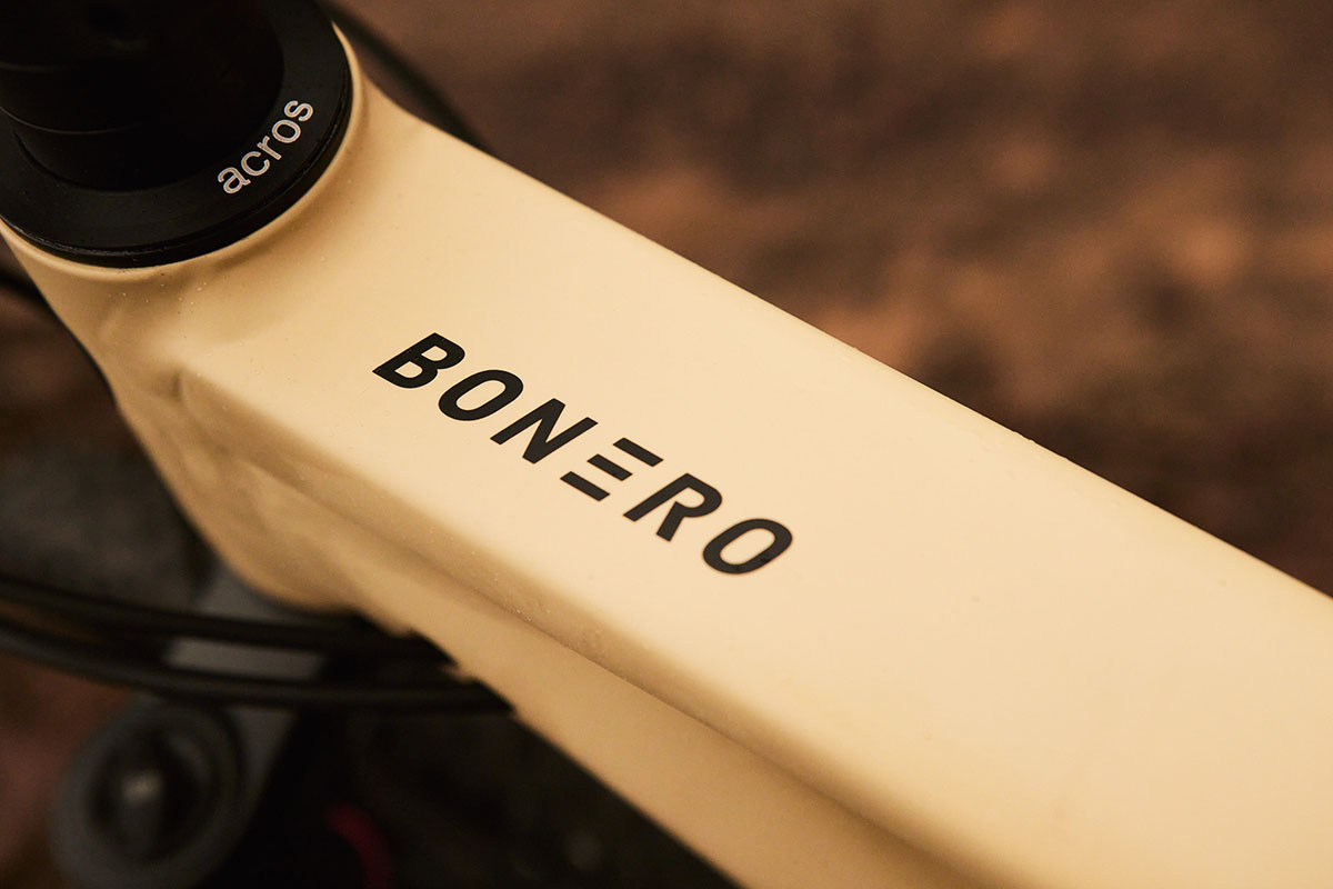 Het aluminium frame biedt ruimte aan banden met een breedte van 2.6”. Rondom de trapaspot (met BSA-schroefdraad) vind je montagepunten voor een kettinggeleider, al levert Rose deze op geen van de drie beschikbare Bonero-modellen standaard mee. Op de onderbuis kun je een bidon kwijt. Op de zitbuis vind je echter géén montagepunten. Onderop de bovenbuis zijn dan wel weer twee montagepunten voorzien om daar een tweede bidon te monteren, of gereedschap en een reservebandje. Tussen de poten van de staande achtervork vind je bovenaan nog montagepunten voor een spatbord of zelfs een drager. De Bonero is daarmee een breed inzetbaar apparaat.