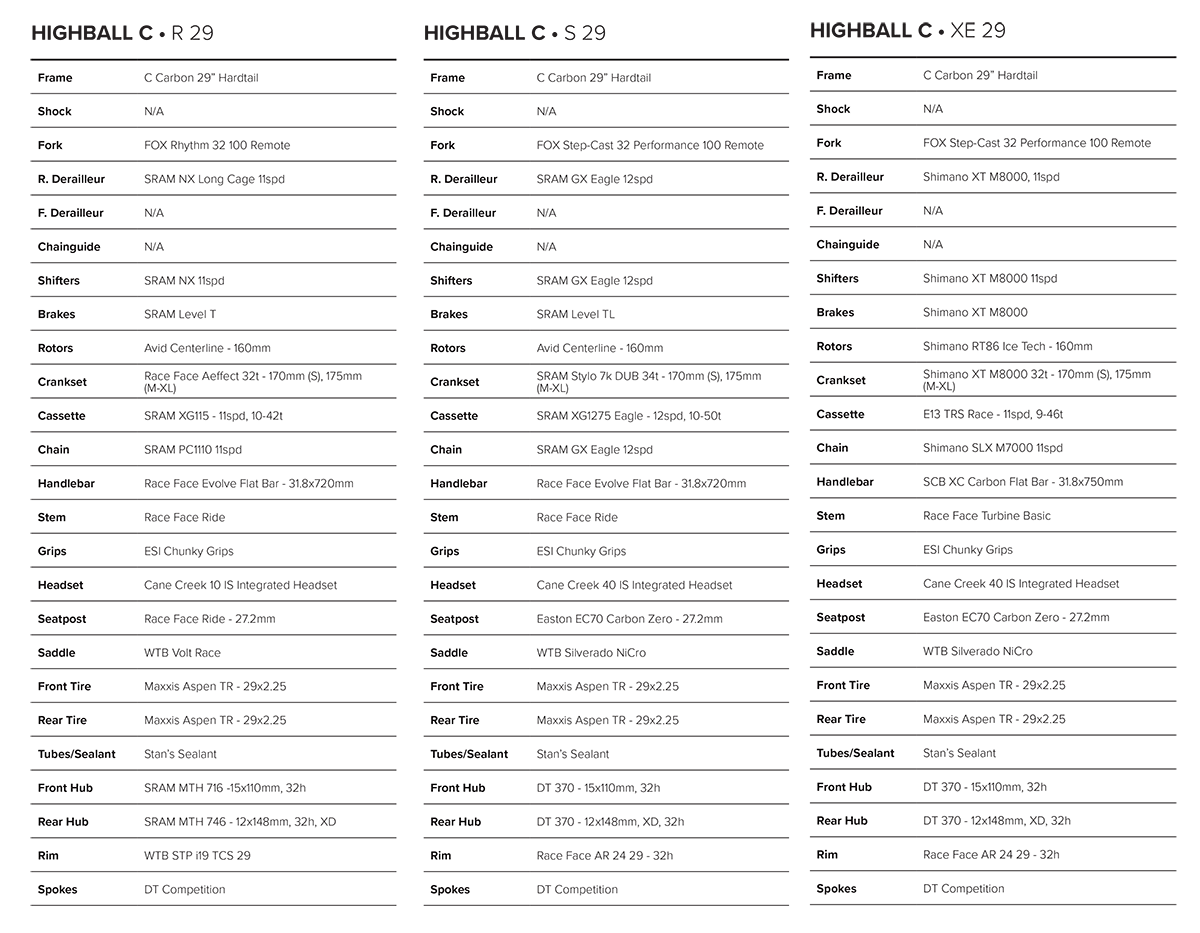 Ook de Highball komt er in een C en CC uitvoering. De CC is de lichtste en weegt Highball in de maat medium nipt onder de 1.000 gram. Het gewicht van de C-versie is ons niet medegedeeld, maar ga er vanuit dat die zo’n 200-250 gram zwaarder zal zijn. Een frame-only optie wordt vooralsnog niet aangeboden in Europa. De Highball is er met een C-frame en een R-kit bestaande uit onder meer een Fox Rhythm voorvork met 100 mm veerweg, SRAM NX 1×11 groepset, SRAM Level T remmen en wat RaceFace goodies voor €3.099. Het topmodel met CC-frame en Santa Cruz’ eigen Reserve (spreekuit: Resurv) carbon wielset doet een heftige €8.299.