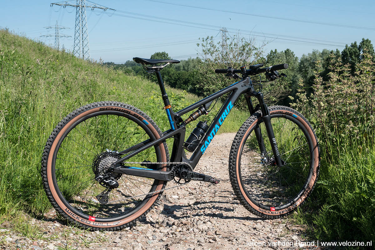 Op onze weegschaal wegen ze per stuk 839 gram; 19 meer dus dan de geclaimde 820 gram. Monteren op een setje Santa Cruz / Reserve carbon wielen met een binnenbreedte van 24 mm was appeltje-eitje. Met 120 ml Doc Blue waren de banden ook meteen luchtdicht en ze lopen niet af. Wat opvalt is dat de band toch wel erg ‘aggressief’ oogt voor iets dat ook thuis zou moeten zijn op een xc fully. Dit komt onder meer door zijn forse volume en behoorlijk vierkante noppen.