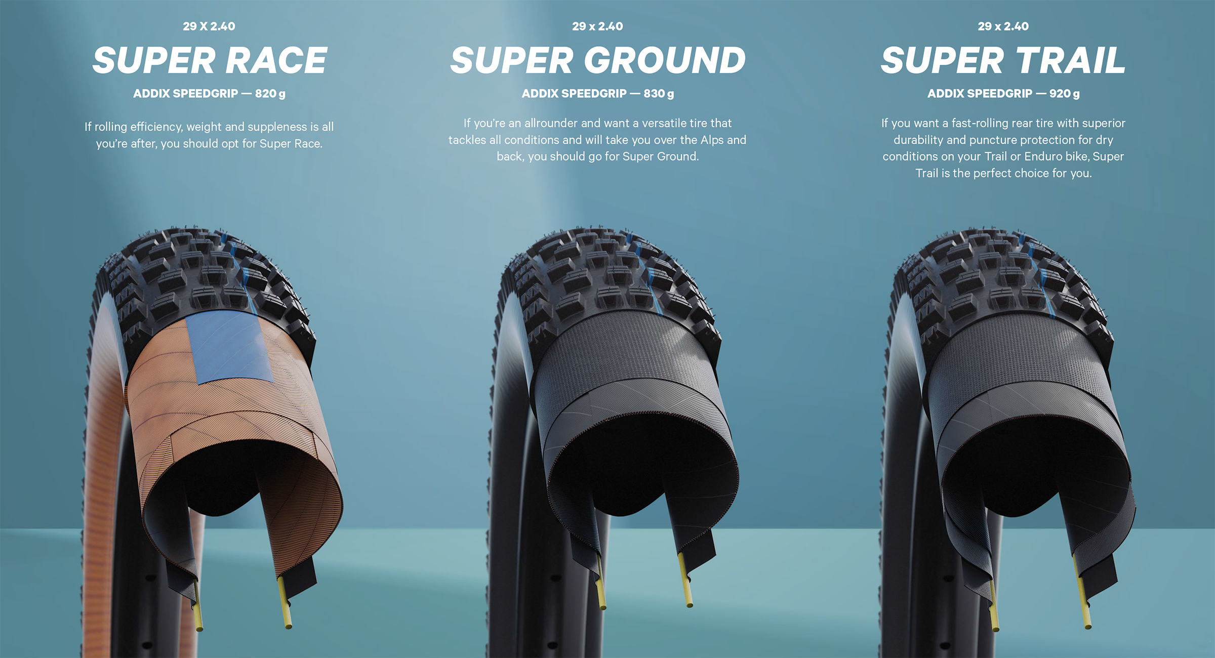 Momenteel is de band in de Benelux alleen verkrijgbaar in 29 x 2.40”, waarbij je de keuze hebt uit drie karkasen: het lichte en soepele Super Race karkas, de meer allround Super Ground of het stevige Super Trail karkas. Die wegen respectievelijk 820, 830 en 920 gram. De Super Race is er alleen met transparante wangen. De Super Ground en Super Trail hebben altijd zwarte wangen. Hij kost € 62,90 en is vanaf begin 2022 verkrijgbaar.