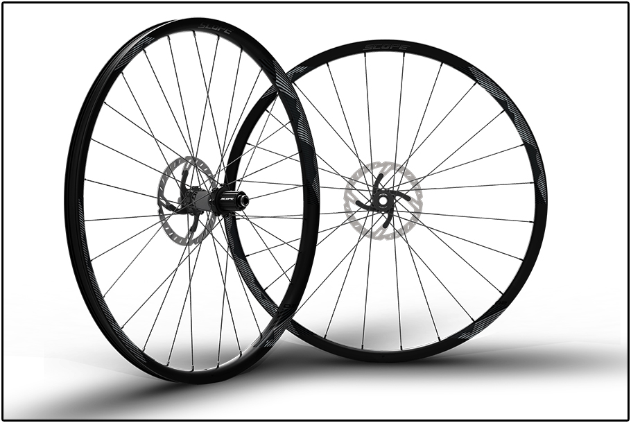 Sapim Laser straightpull spaken verbinden de velgen met de naven. Vooraan met een 2x en 1x kruisend spaakpatroon, achteraan een 2x kruisend. In tegenstelling tot veel andere wielleveranciers, maakt Scope geen gebruik van naven uit Zwitserland. Ze hebben eigen naven die voorzien zijn van SKF industrielagers, of op wens met lagers van Ceramic Speed. De vrijloop werkt met 4 pallen; over het aantal ingrijpingen rept het persbericht helaas niet. Uiteraard zijn zowel Shimano als XD vrijlopen beschikbaar. De schrijfremmen worden gemonteerd via een Centerlock verbinding.