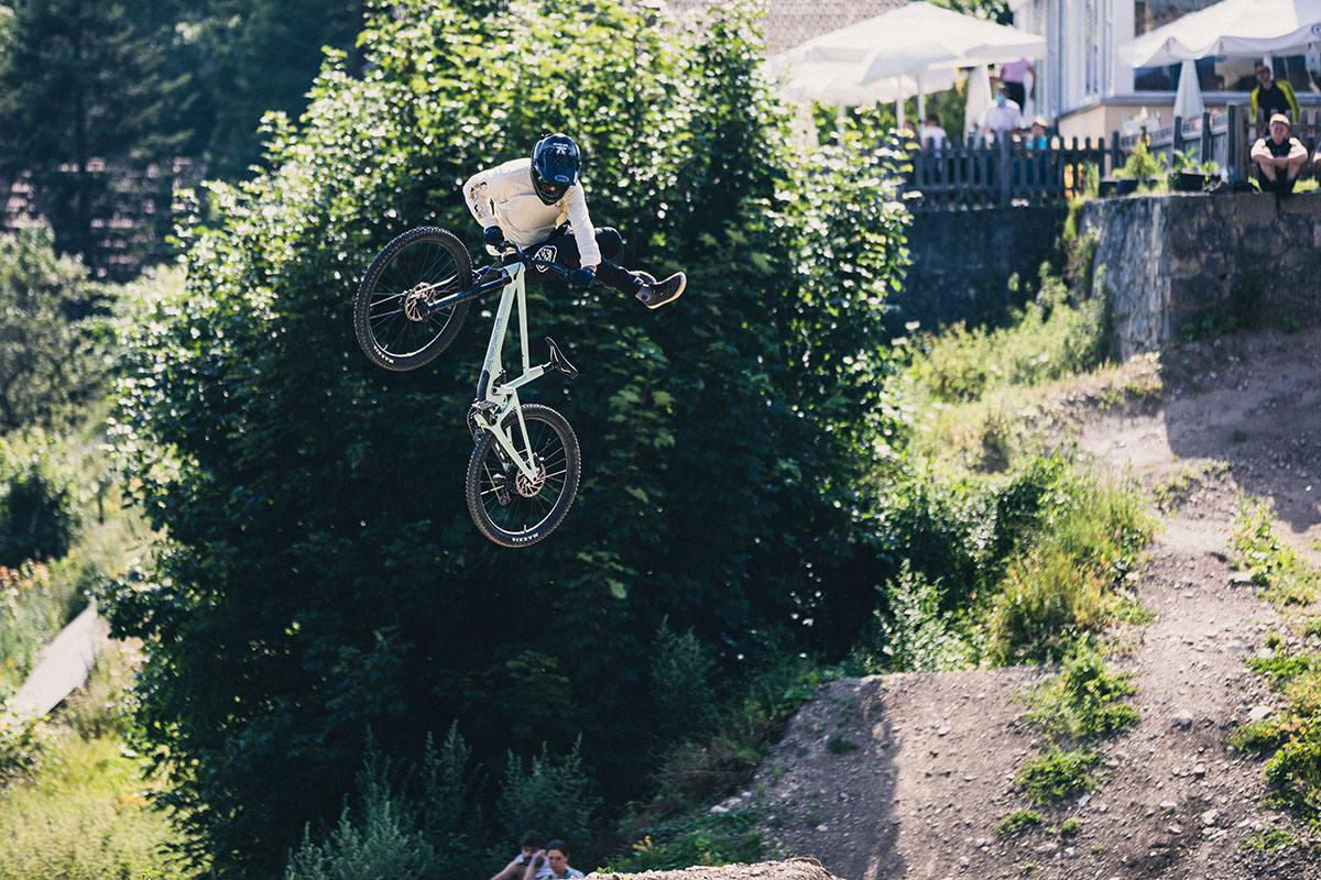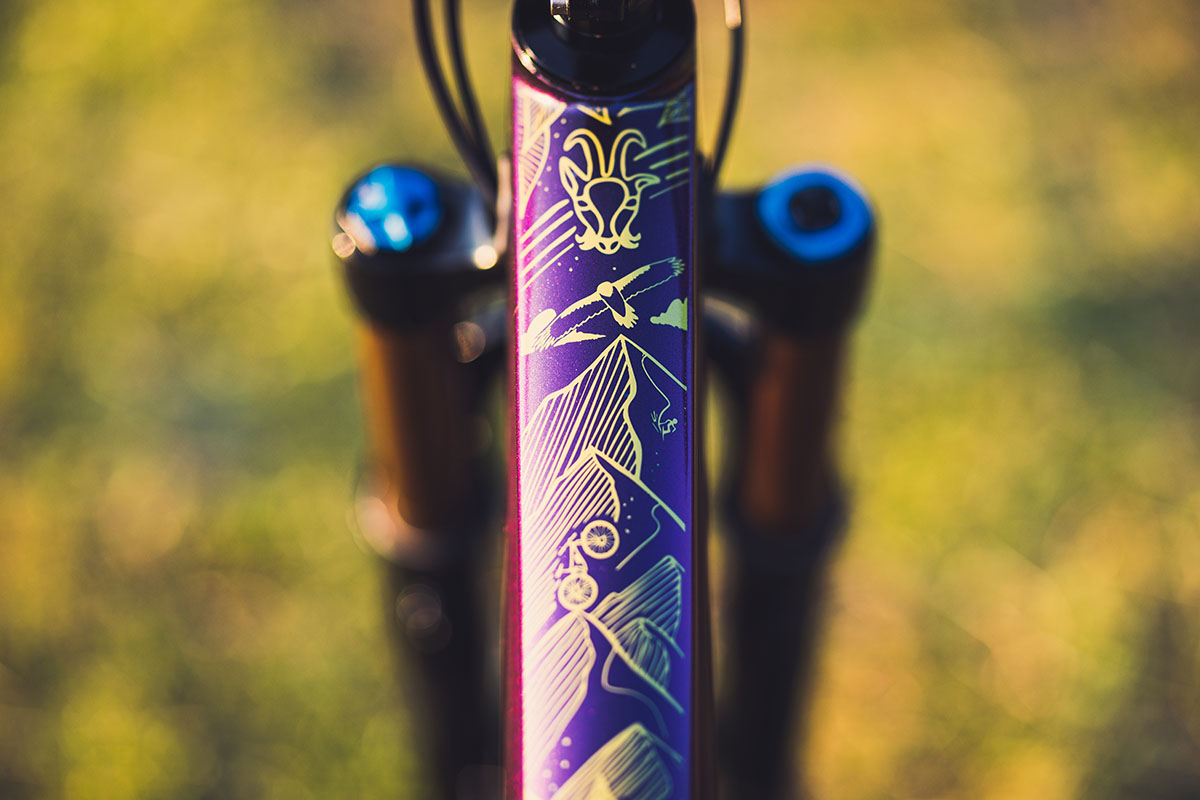 Dat begon met het aanpassen van een BMC Trailfox. Daar werd letterlijk de zaag in gezet; de balhoofdbuis werd onder een andere hoek en verder naar voren terug aan het frame gelamineerd. Het achterwiel werd verder naar voren gezet, door kortere links te fabriceren die voor- en achterframe met elkaar verbinden. De Frankenstein-BMC bleek perfect te werken voor de trails in de Jura. Intussen kreeg David Zurcher – de baas van BMC en zelf fan van ‘dikke’ bikes voor het ruigere werk – lucht van het project. En in plaats van beide knutselaars te sommeren zich te focussen op de richting waarin BMC zijn vizier heeft, gaf hij ze de ruimte om tijdens werkuren door te werken aan hun ideeën.
