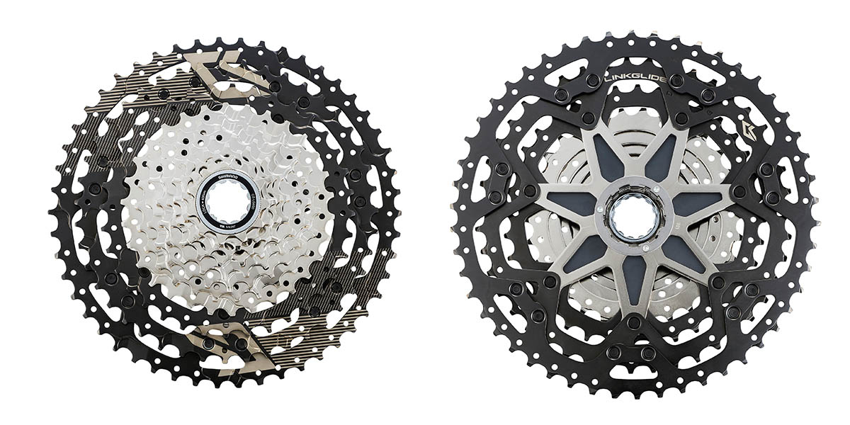 Op Deore XT-niveau biedt Shimano de nieuwe 11-speed cassette aan met een spreiding van 11 tot 50 tanden. Deze cassette weegt 780 gram. Ter vergelijk; een Deore XT 12-speed 10-45t cassette weegt 472 gram. De Deore 10-speed Linkglide-cassette heeft een vertanding van 11-43t en weegt 634 gram. Die relatief hoge gewichten komen dus voort uit de dikkere kransen én de stalen spiders die de kransen onderling verbinden. Saillant detail is dat beide cassettes niet een Microspline-passing hebben, maar de reguliere, bekende HG-passing.