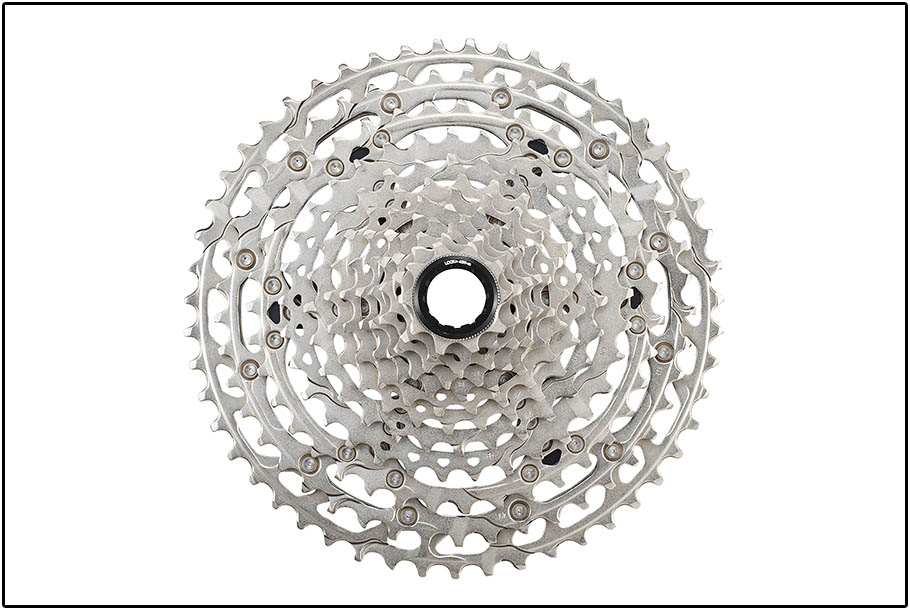 Bij deze 12-speed groepset heb je één cassette-optie: een 10-51t. Een compactere 10-45t, zoals bij SLX, XT en XTR, is er dus niet. De verbinding met de achternaaf is uiteraard van het Microspline-type. Omwille van de stijfheid van de grote kransen is óók deze cassette opgebouwd met een spider-constructie, die we voorheen alleen nog zagen bij de duurdere groepsets. Alle kransen zijn van staal; een lichtgewicht zal het dus niet zijn. De vertanding heeft ook het Hyperglide+ ontwerp, waardoor zowel het op- als afschakelen onder last een stuk soepeler én sneller zou verlopen.