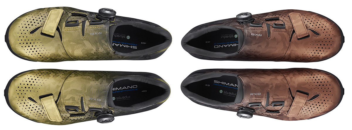 Het kunstlederen bovenwerk van de Shimano RX8 is gemaakt uit één stuk synthetisch leer. Ten behoeve van de ventilatie is dat voorzien van strategische geplaatste perforaties. De inlegzool heeft een anti-bacteriële behandeling ondergaan, waardoor onaangename geurtjes niet optreden.