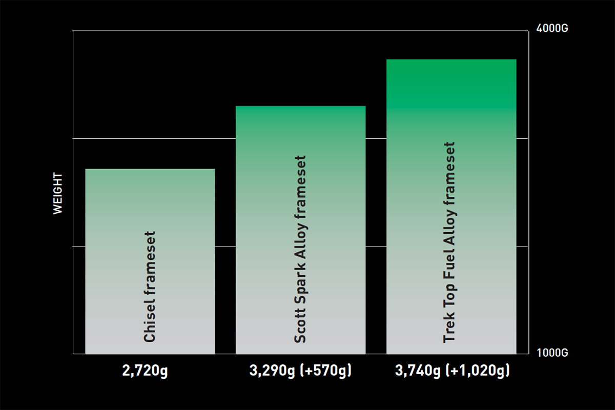 Qua veersysteem en veerweg leunt de aluminium Chisel sterk op de nog niet zo lang geleden geïntroduceerde Epic 8. Toch is de Chisel anders. Daar waar de Epic 8 120 millimeter veerweg aan de achterkant heeft, daar moet de Chisel het stellen met ‘maar’ 110 millimeter. Aan de voorkant zijn beide bikes met 120 millimeter veerweg wel gelijk bedeeld.