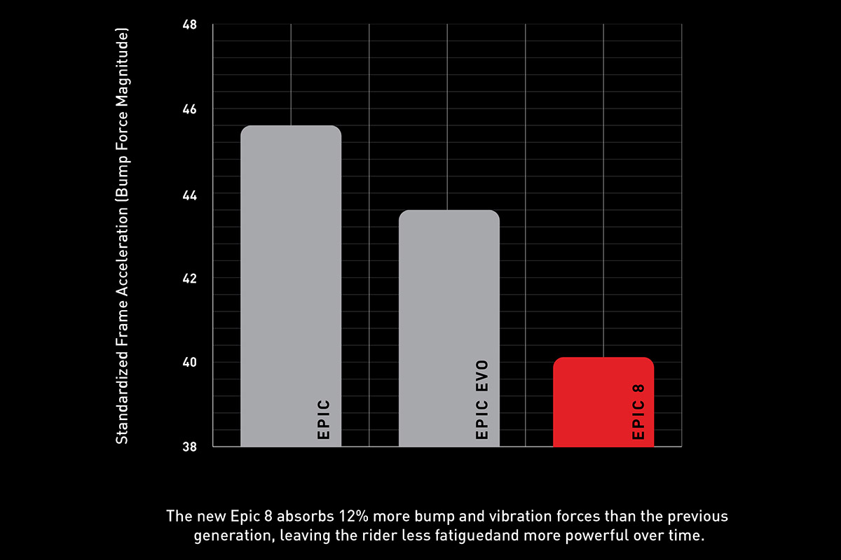 De overige Epic 8 modellen komen nú zonder systeem om de demping automatisch te reguleren. Niet mechanisch en niet elektronisch. Toch claimt Specialized twintig procent méér efficiëntie. Dat wil zeggen, in vergelijking met de vorige Epic Evo, die sowieso geen Brain-vering had. Hoe de nieuwe Epics zich qua efficiëntie verhouden ten opzichte van de oude modellen mét Brain, vermeldt Specialized niet. Nu we toch met percentages strooien: de Epic 8 zou twaalf procent beter trillingen en schokken absorberen. De gedachte hierachter: hoe minder vermoeid de rijder raakt, hoe groter de kans dat-ie als eerste over de finish gaat.