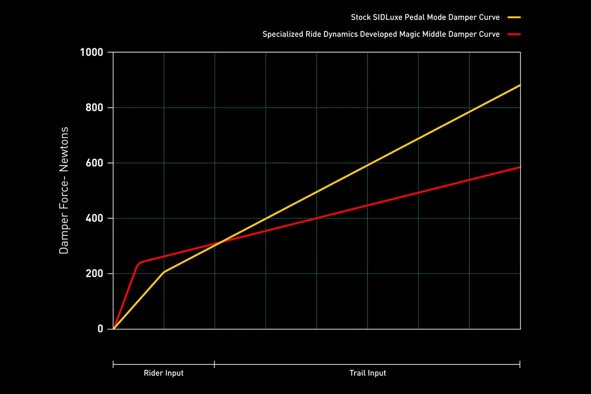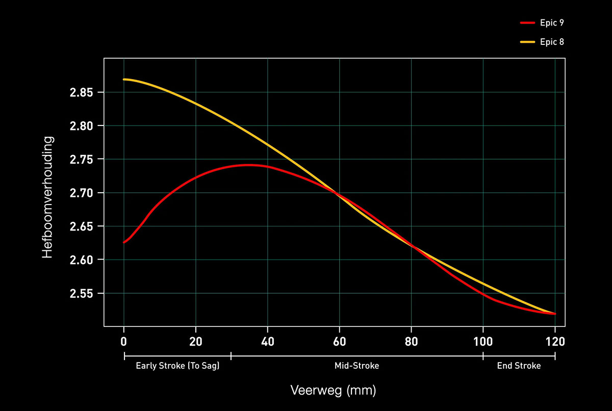 Dat wil niet zeggen dat de Epic 8 en Epic 9 qua vering gelijk zijn, zo benadrukt Chance Ferro. Deze suspension-engineer claimt dat door de optimalisatie van het systeem de vering elf procent soepeler aanspreekt. Daardoor kon de hefboom rond het sag-punt verkleind worden, wat gunstig is voor de efficiëntie. Voor het soepel absorberen van grote klappen is de veercurve van de Epic 8 gehandhaafd. “Het resultaat is dus meer ondersteuning in het vlakke en tijdens klimmen en meer comfort en controle in afdalingen”, aldus Ferro.