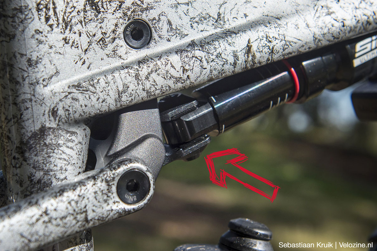 Naast een Swat-box passen er ook nog twee bidons in de voordriehoek. Dat er zoveel ruimte is komt op het conto van de demperophanging die in grote lijnen is overgenomen van de Epic World Cup, met een demper die voor ongeveer de helft ín de bovenbuis valt. Die ziet er niet alleen clean uit, maar spaart ook ruimte. Eens te meer omdat de Y-vormige yoke en de hevel op de zitbuis die het veersysteem van de Epic 8 kenmerkten verdwenen zijn. In plaats daarvan zit er, net als bij de Epic World Cup, een klein stangetje tussen de bovenbuis en het onderste demperoog.