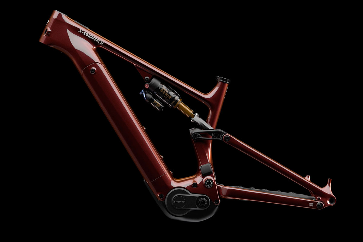 Het frame van de Turbo Levo 4, ook de S-Works-uitvoering, is gemaakt van Specializeds Fact 11M-carbon. Over hoeveel dit frame minder of meer weegt dan het frame van de Levo 3 doet Specialized geen uitspraken. Een aantal veranderingen is niet te missen. Zo is de accu nu toegankelijk via een klep aan de zijkant van de onderbuis. Zo’n constructie is over het algemeen minder licht dan een opening bij de motor, zoals bij de Levo 3. Maar wel veel praktischer, een aspect dat door Specialized benadrukt wordt.