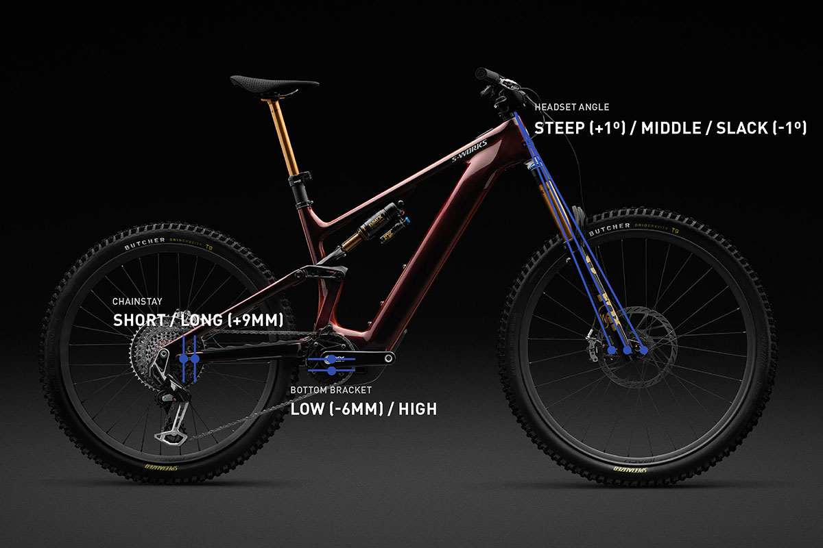 Met de geometrie van de Turbo Levo 4 borduurt Specialized in hoge mate voort op de inzichten en ervaringen die zijn opgedaan met de Levo SL. In het geval van een Levo 4 in maat S4 komt dat neer op een balhoofdbuishoek van 64,5 graden, een zitbuishoek van 77 graden en een reach en een stack van 480 en 638 millimeter. De liggende achtervork meet 435 millimeter meet, de trapas staat 350 millimeter boven de grond. En vervolgens kan je bijna al die waarden naar eigen smaak aanpassen, want door middel van draaibare lagerschalen en chips in de liggende achtervork en bij het onderste demperoog is de basisgeometrie een allesbehalve vast gegeven.