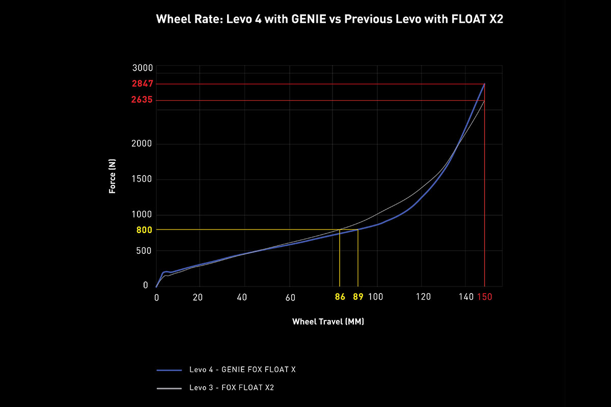 Door de overbrengingsverhoudingen te optimaliseren en met een lagere luchtdruk te werken, spreekt een demper eerder en soepeler aan. Nadeel van een dergelijk karakter is dat de demper vanwege een te geringe progressiviteit te snel door z’n veerweg kan razen. Hier komt de Genie-demper op de Levo 4 om de hoek kijken. Deze demper, die Specialized al eerder toepaste op de de Stumpjumper en de Levo SL, beschikt over twee luchtkamers; een interne luchtkamer zoals alle dempers die hebben en een externe luchtkamer. Gedurende twee derde van de ingaande slag zijn beide luchtkamers onderling met elkaar verbonden. Vanwege het relatief grote luchtvolume en de relatief lage druk spreekt de vering aan het begin van de slag soepel aan, waarna de tegendruk in de loop van de slag steeds meer toeneemt.