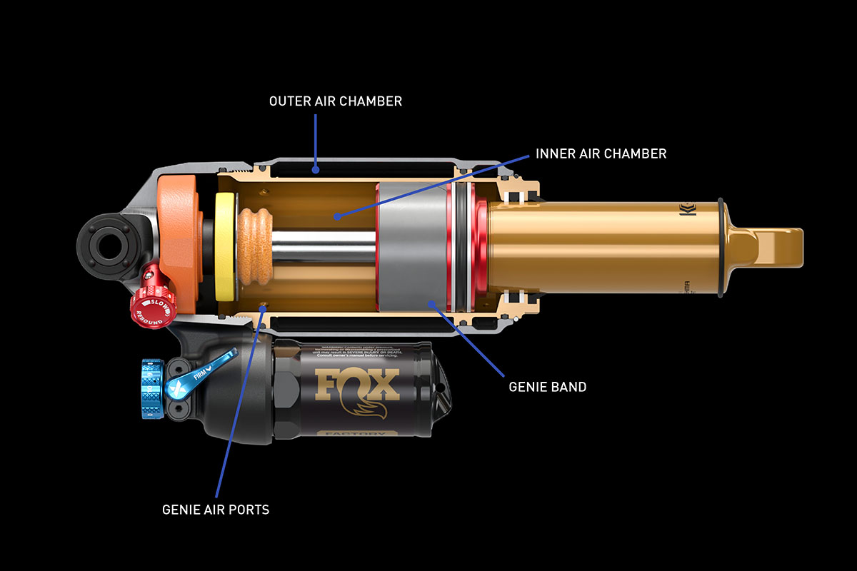 De truc van de Genie-demper zit in het laatste derde deel van de slag. Een brede, boven de zuiger geplaatste kunststof glijbus, door Specialized Genie-band genoemd, sluit op twee derde van de ingaande slag de externe luchtkamer af van de interne luchtkamer, waardoor het beschikbare volume afneemt. Oftewel: de luchtdruk neemt vanaf dat punt flink toe, waardoor de vering zich verhard en effectief voorkomen wordt dat de vering op het eind van de veerweg doorslaat. Deze vinding is de reden dat Specialized het beste van twee werelden durft te claimen: soepel aanspreken aan het begin van de slag en optimale ondersteuning aan het eind. Klinkt supersimpel, en dat is het in feite ook, maar je moet er nét maar opkomen. Zie je het niet helemaal voor je? Check dan dit plaatje even.