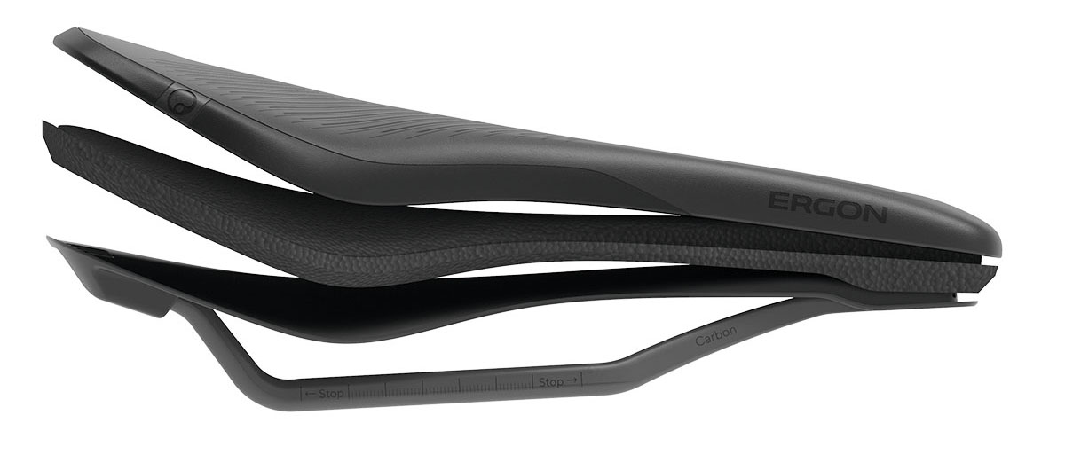 Ergon sandwiched de Infinergy-schuimlaag tussen de kunststof zadelschaal en het zadeldek. In tegenstelling tot SQlab minimaliseert Ergon dit zadeldek niet tot nagenoeg niets, maar maken ze dit van ‘orthopedic AirCell foam‘, dat niet alleen zeer licht zou zijn, maar ook voor een stevig gevoel zorgt. Uiteraard maken alleen Infinergy en AirCell een zadel nog niet Ergon-typisch ergonomisch; dan moet er ook nog een uitsparing in zitten. En natuurlijk zit die er. Ergon claimt dat de uitsparing (bij mannen) drukpunten op de gevoelige delen volledig tegengaat. En uiteraard komen de SR Allroad Core’s in verschillende breedtematen, passend bij de afstand tussen jouw zitbotjes.