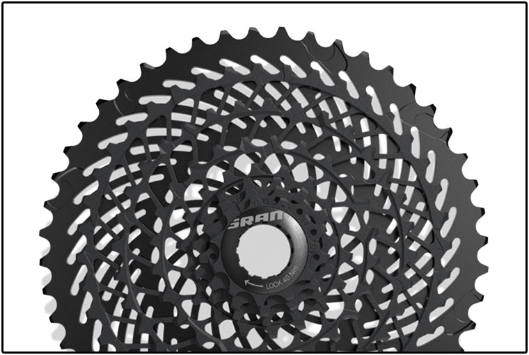 SRAM nut dit aspect uit door genoeg spreiding aan te bieden, zonder ‘een hoop versnellingen die men toch niet gebruikt’. Het resultaat is een compacte cassette die maakt dat de kettinglijn gemiddeld genomen rechter blijft wat de duurzaamheid ten goede komt. Tot zover logisch.