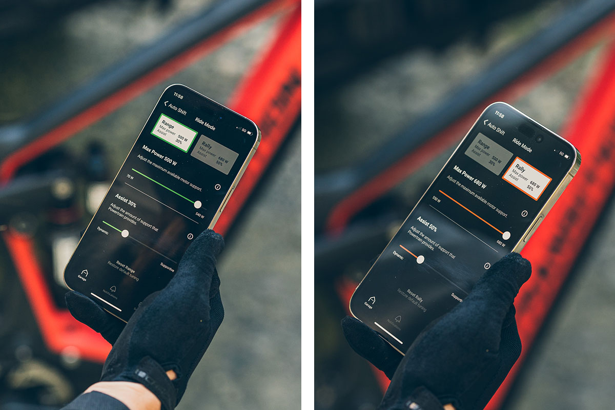 Sram zet Eagle Powertrain duidelijk in de markt voor ‘performance mountainbiking’, aldus het persbericht. Daarbij is het versimpelen van het gebruik hét uitgangspunt geweest. Sram biedt daarom slechts twee dyamische ondersteuningsstanden bij Eagle Powertrain. In de ‘Range Mode’ is de ondersteuning afgestemd op langere ritten en gemakkelijker terrein, waarbij de ondersteuning dus eerder conservatief is om de acculading te sparen. Voor kortere en meer intensieve ritten, of secties tijdens je langere rit, schakel je naar de ‘Rally mode’ voor maximale ondersteuning. Ingewikkelder dan dat wordt het niet. Beide standen zijn dynamisch, wat zo veel wil zeggen dat ze de mate van ondersteuning continu aanpassen aan de input die je zelf geeft via de pedalen. Beide standen kun je via de bluetooth verbinding met een app naar wens verder aanpassen.