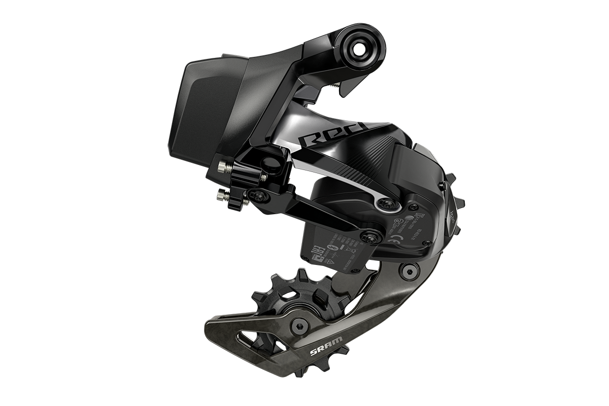 Om de achterderailleur te laten werken met een grotere cassette, veranderde Sram bij de Force eTap AXS achterderailleur de lengte van het bovenste deel. Daarmee kwam het parallellogram en zodoende de kettingkooi in zijn geheel wat lager onder de cassette te staan en ontstond er zo ruimte voor een groter kettingblad. Dat zelfde trucje passen ze nu dus óók toe bij de Red eTap AXS derailleur om een Wide-variant neer te zetten.