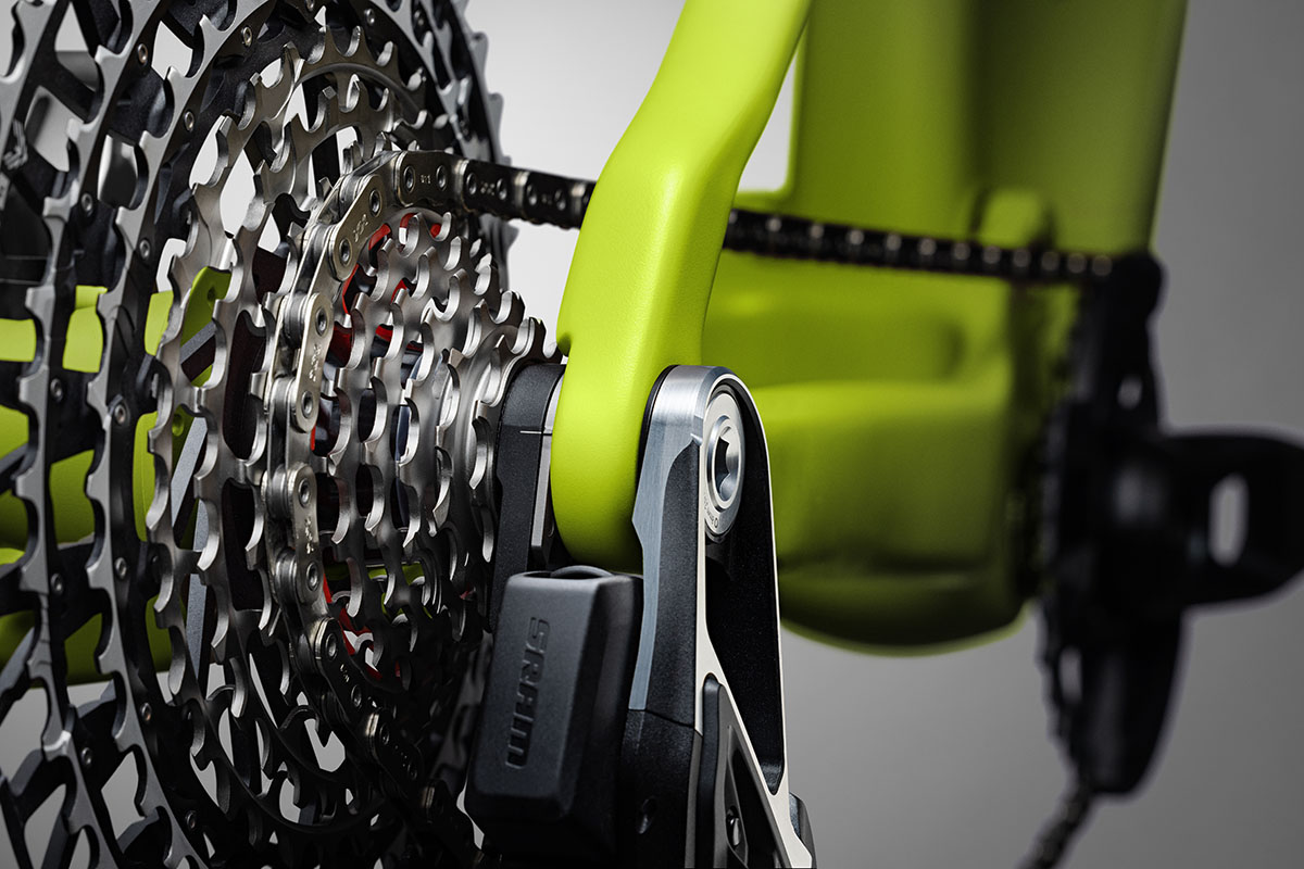 Srams full-mount-derailleurs monteer je volledig óm een UDH-frame-uiteinde. De binnenzijde van de derailleurmontage is meteen de aanslag voor je achterwiel en de steekas schroef je ook hierin vast. Samen met de goed gedefinieerde Sram XDR-cassette passing op achternaven, is de exacte positie van zowel cassette als derailleur daarmee erg nauwkeurig bepaald. Bovendien is het geheel véél stijver. En met die stijfheid én nauwkeurigheid weet Sram daarom meteen twee zaken in de kiem te smoren die méér kransjes en schakelprecisie in de weg zaten.