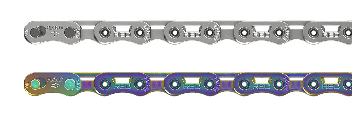 Door de full mount constructie heeft Sram de cassette dus 13 kransen kunnen geven, gebaseerd op 12-speed spatie. Er is dus géén specifieke Red XPLR AXS 13-speed ketting, maar de 13-speed groep werkt dus met de flattop-exemplaren van de 12-speed Red-groep. Deze HollowPin-ketting is met 236 gram (114 links) Srams lichtste ketting en bovendien de stilste, zo claimt Sram.