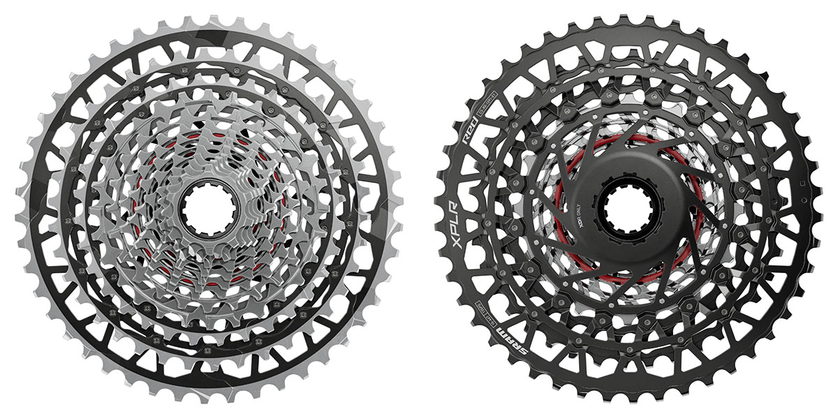 Qua constructie volgt de Red XPLR-cassette de Transmission-tegenhangers. De onderste tien kransen zijn uit één stuk staal gefreesd. De grootste drie kransen zijn individueel uit aluminium gesmeed en onderling met pinnen verbonden. Het geheel weegt daardoor 288 gram, wat voor een cassette met dit bereik licht is.