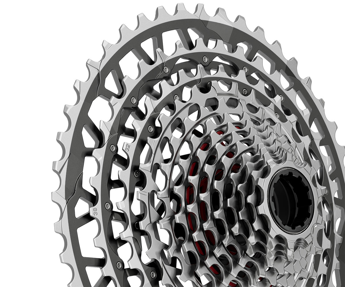 Verspreid over 13 kransjes – 10, 11, 12, 13, 15, 17, 19, 21, 24, 28, 32, 38, 46t – biedt Sram met Red XPLR-cassette een groter bereik van 460 procent, terwijl onderop de sprongen wat zijn verkleind voor een optimale cadans.