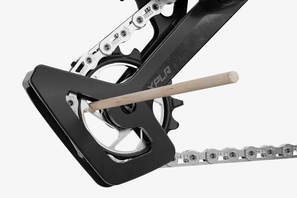 De Red XPLR AXS-derailleur heeft een clutch die werkt op basis van een veer en wrijvingsmechanisme in het scharnierpunt van de kettingkooi, om daarmee klapperen (en aflopen) van de ketting zo goed mogelijk tegen te gaan. De cage lock laat je vervolgens toe om de kettingkooi naar voren toe vast te zetten, om een wielwissel te vergemakkelijken.