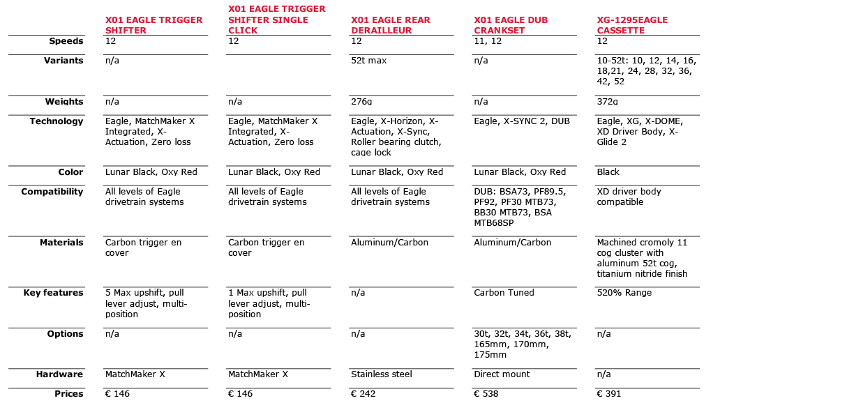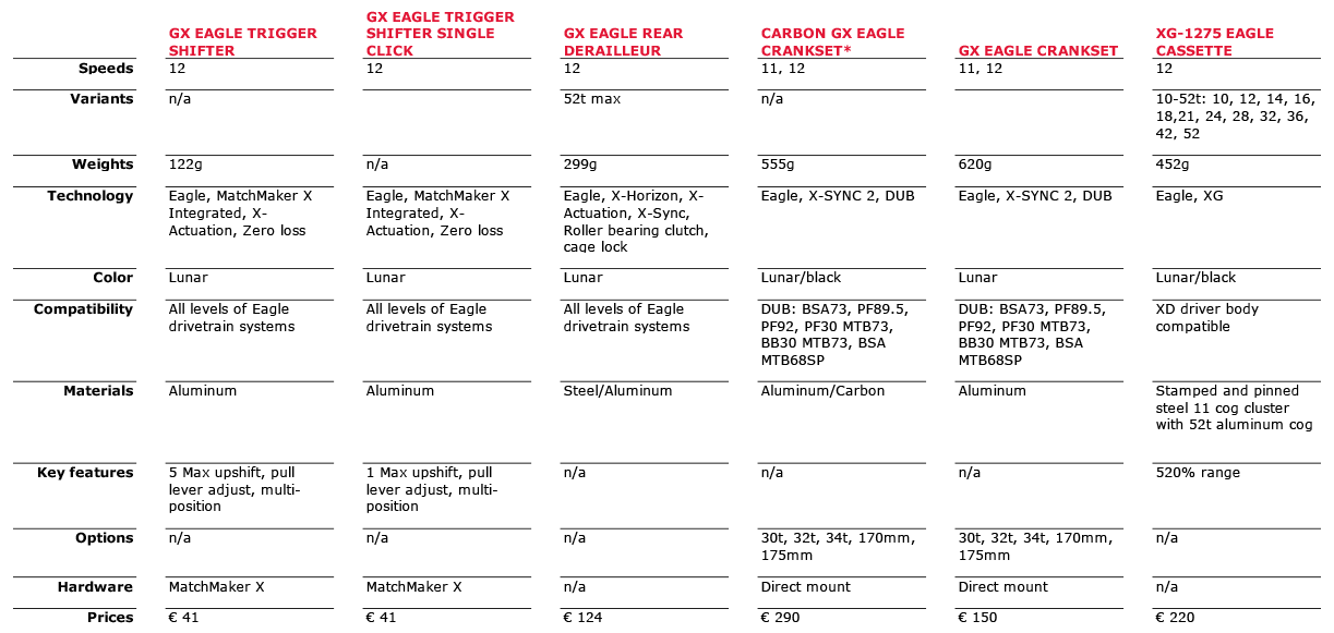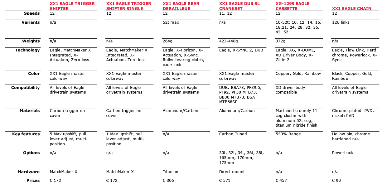 In feite lanceert Sram ‘deels’ nieuwe groepsets. Een groot aantal onderdelen komen ‘over’ vanuit de bestaande Eagle groepsets. Navolgende overzichten geven de prijzen en specificaties van de belangrijkste onderdelen die vernieuwd zijn (qua technologie of kleur-opties). De Eagle GX carbon crank is vooralsnog niet los te koop echter. Alle ‘Eagle Versie 2’ onderdelen zijn per direct leverbaar.