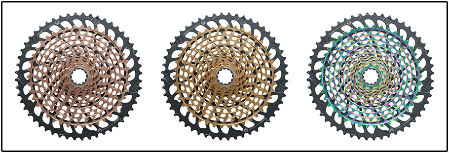 Met de lancering van deze upgrade worden ook de kleuropties verandert. GX Eagle is er in één versie, waarbij de accentkleur ‘lunar’ wordt genoemd en terugkomt op diverse componenten van de groepset. Deze understated kleur past overal bij. Méér kleurcoördinatie is mogelijk met X01 en XX1 groepen. X01 Eagle combineert mat zwart met ‘polar’ grijs, of mat zwart met polar grijs én rode accenten. De XG-1295 cassette (X01-niveau) is altijd zwart. De XX1 Eagle derailleur, shifter en cranks zijn eveneens mat zwart met grijs, maar bij de cassettes kun je nu naast de regenboog / ‘oil-slick’ kleur en goud óók kiezen voor koper. Bijpassende kettingen zijn er ook, evenals een zwarte.
