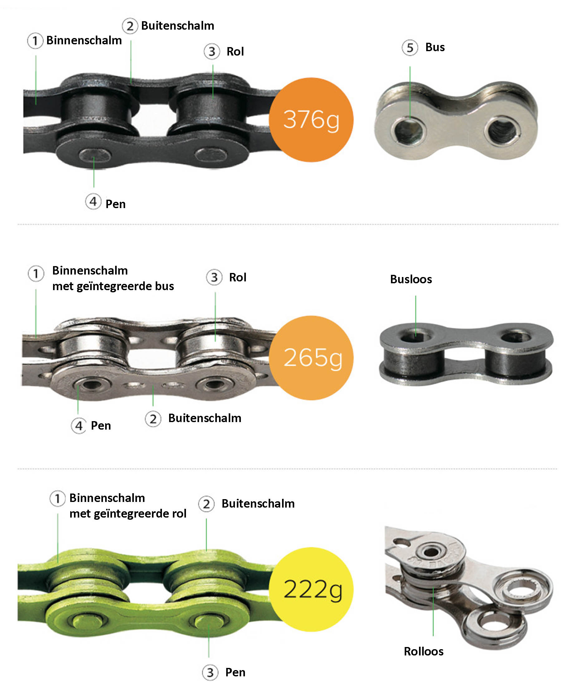 Bij moderne kettingen is de bus, waardoor de pen loopt, samengesteld met de binnenschalmen. Hierdoor wordt ook een ‘schouder’ gevormd aan de binnenzijde van de binnenschalm, waar vervolgens het rolletje op draait. Door het weglaten van de rolletjes, kan Taya nu die schouders aan binnenzijde van de binnenschalmen groter maken. En groter betekent in dit geval ‘meer materiaal rondom’, waardoor het gat wat dóór de bus loopt minder snel zal vervormen. Gecombineerd met hardere materialen en coatingen zou dat dus inderdaad minder slijtage op kunnen leveren. Of dat een factor 3 is, zoals Taya claimt? Dat zoeken we graag zelf uit…