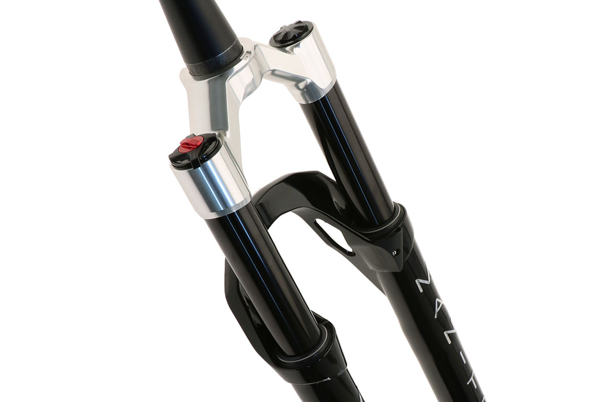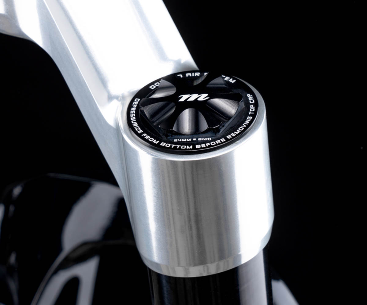 Opvallend is dat Manitou de R8 Pro Trail Side Relief-kleppen op de onderpoten meegeeft. Hiermee laat je opgebouwde druk tussen de binnen- en buitenpoten af. Door onder meer temperatuursverschillen bouwt in elk vork druk op tussen binnen- en buitenpoten. Die druk heeft vervolgens effect op de souplesse van de vork want in feite ontstaat er een luchtveer die tégen de interne luchtveer inwerkt. Andersom kan er ook onderdruk ontstaan, waardoor vuil langs de afdichtingen rond de binnenpoten naar binnen getrokken kan worden. Op veel vorken met véél veerweg is dit probleem best groot en dus vind je daar tegenwoordig drukaflaatventielen. Kleine knopjes, achterop de onderpoten net onder de afdichtingen.