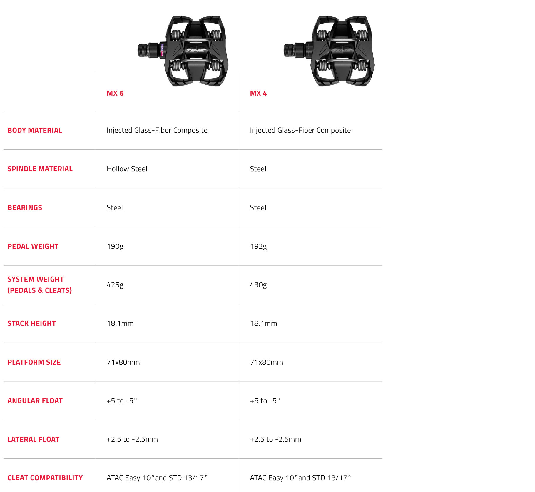 Time bracht het systeem naar mountainbikers in de vorm van de XC- en MX- en Speciale-pedalen, met in totaal elf pedalen. Dat wordt nu ingedikt naar zeven stuks, zoals het overzicht hieronder laat zien. Bij de pedalen met vergroot platform zijn de MX2 en de DH4 verdwenen. En bij de XC-pedalen zijn de XC 2, XC 4 en opvallend genoeg de XC 8 geschrapt.