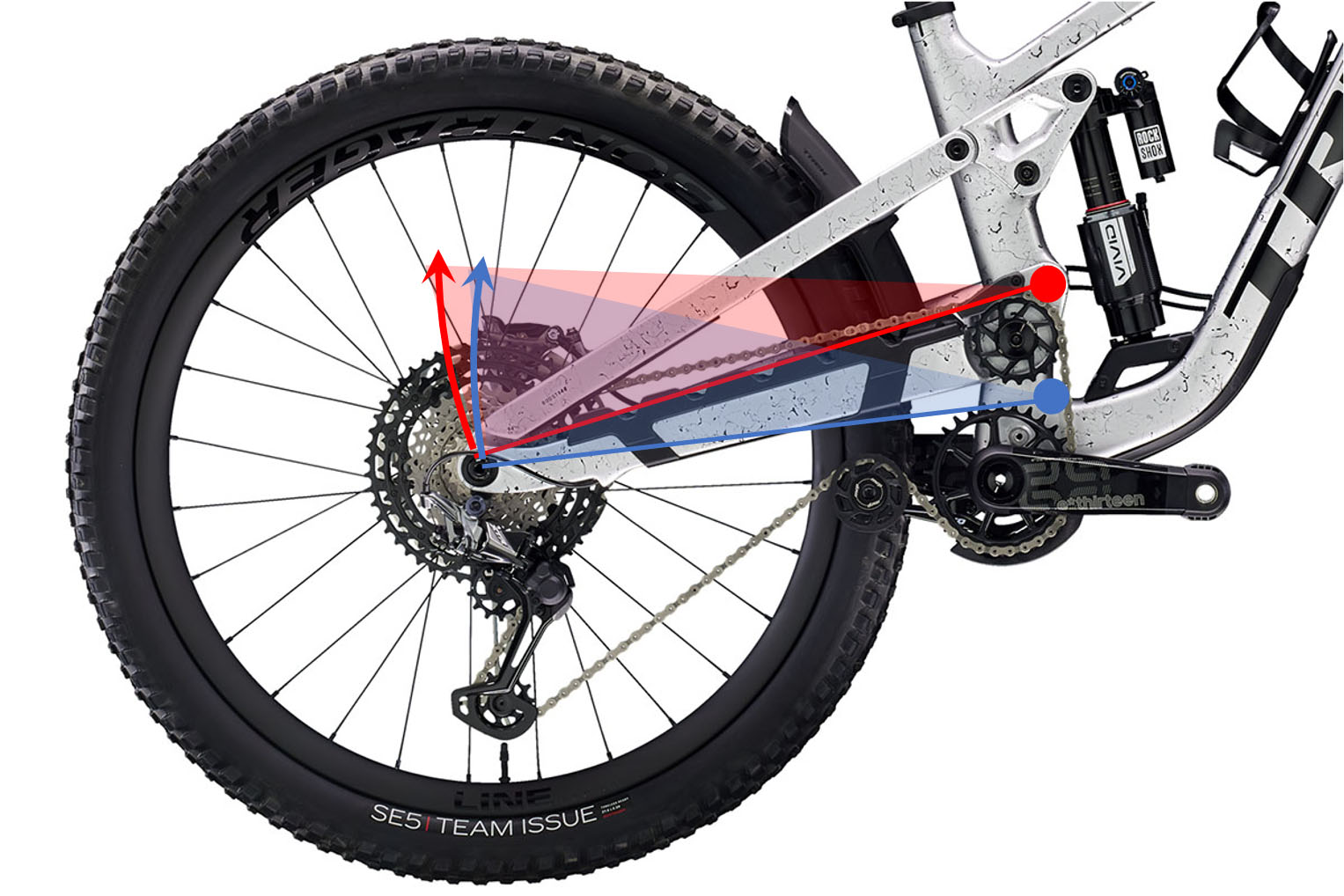 Het concept komt ook met een aantal nadelen. Om de invloed van trapkracht te minimaliseren wordt de ketting ergens in de buurt van het hoofdscharnierpunt over een extra kettingwieltje geleid. Dat voegt niet alleen gewicht toe, maar het betekent ook dat de aandrijvinging iets meer weerstand heeft. Het voordeel is echter dat met de plaatsing van het kettingwieltje heel nauwkeurig die mate van trapinvloed (anti-squat) kan worden bepaald. Trek claimt met de door hun gekozen opstelling met de nieuwe Slash een alsnog erg goed klimmende high pivot-bike te hebben neergezet.