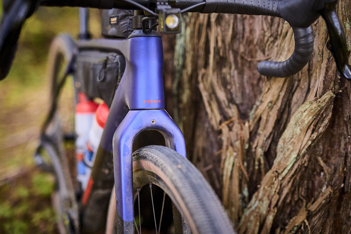 Het nieuwe frame, gemaakt van Treks OCLV 800 carbon, biedt ruimte aan banden tot 45 millimeter. Als een bredere band nodig is voor jouw rit, dan is de Checkmate SLR simpelweg niet de uitgewezen gravelbike. Opbergruimte ín het frame is er niet. Met oog op het framegewicht koos Trek er voor om geen luikje in de onderbuis te maken. Het Checkmate SLR frame weegt in de maat ML 1.146 gram, aldus Trek. De voorvork weegt 415 gram. Deze gewichten zijn inclusief de lak.