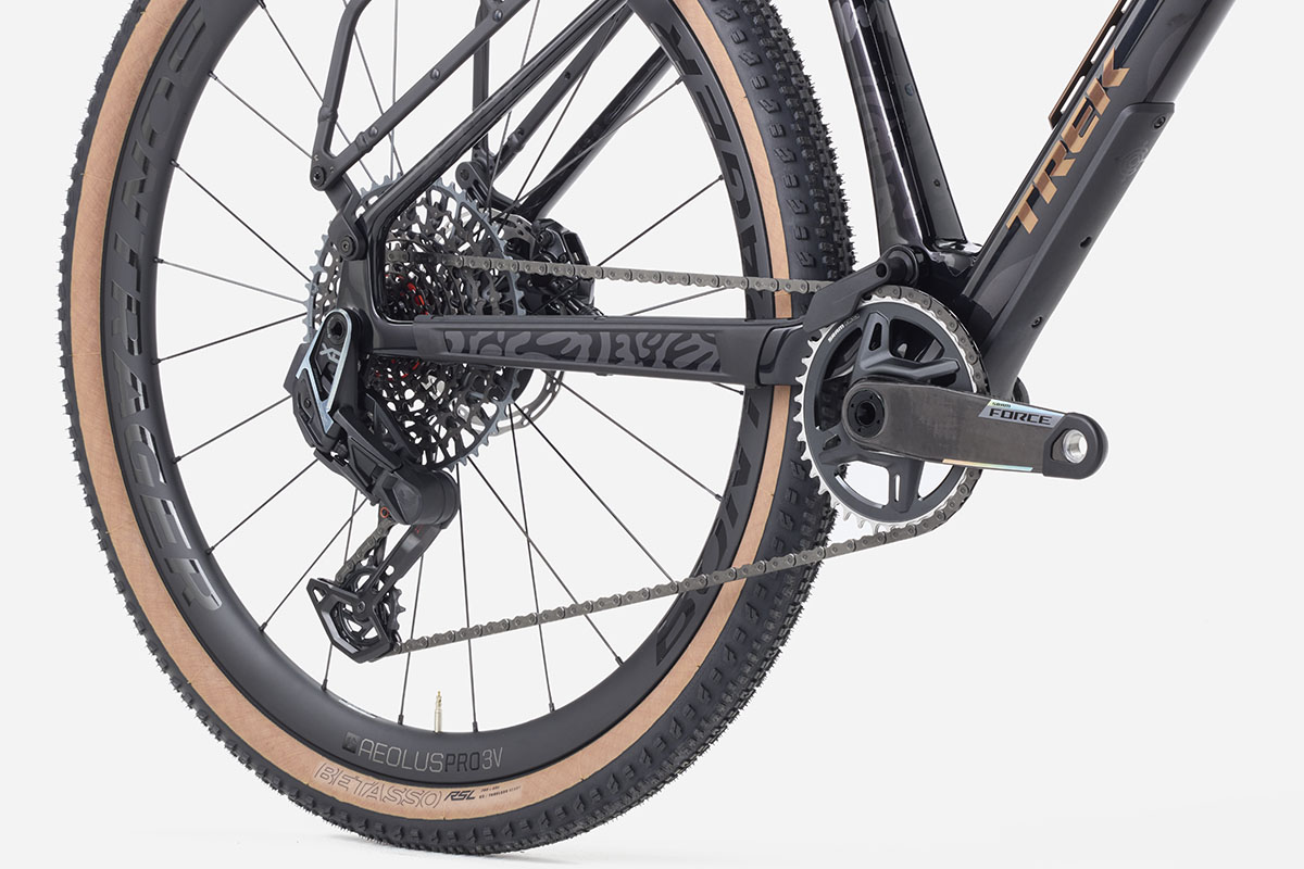 Voor 2.000 euro meer (dus 6.999 euro) is er de Checkout SL 7 AXS. Hierbij schakel je draadloos in de vorm van Sram Force AXS-grepen en een XO Eagle Transmission-derailleur in combinatie met een Sram XS-1295 T-Type 10/52t-cassette met een bereik van 520 procent. De SL 7 is ook voorzien van de 50 millimeter Betasso-banden, maar die zijn bij deze bike gemonteerd op carbon Bontrager Aeolus Pro 3V-wielen. Qua dropper krijgt de SL 7 de draadloze Rockshox Reverb AXS mee, met 100 millimeter verstelweg. Volgens Trek weegt de Checkout SL 7 AXS 11,28 kilo (maat ML).