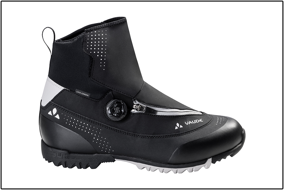 Als je snel last hebt van koude voeten tijdens het fietsen kun je natuurlijk dikkere sokken aan doen. Maar vaak passen de schoenen dan niet heel fijn meer. Overschoenen houden ook wel wát warmte vast, maar in de blubber zijn ze niet echt ideaal wanneer je eens een stuk moet klunen; geen grip en vervolgens lastig(er) inklikken. In plaats van je schoenen winterklaar maken, kun je ook gewoon een andere schoen overwegen. Zo biedt Vaude nu de Minaki Mid CPX.