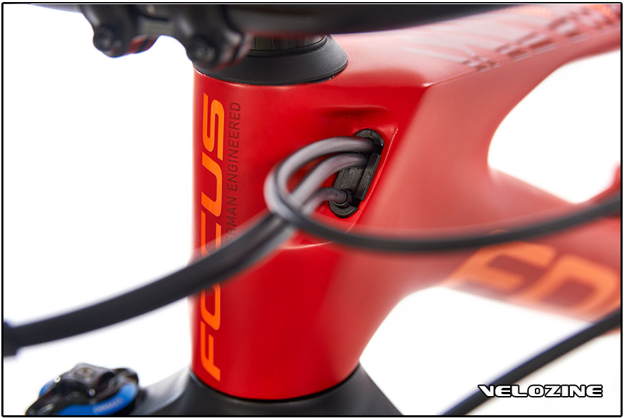 Qua details hebben de Focus engineers niet zitten slapen: de achtervork van de SAM C is gelagerd op basis van industrielagers, waarbij het scharnierpunt nabij de dropouts is uitgevoerd met twee industrielagers per zijde. De kabelgeleiding loopt binnen door en oogt doordacht, met één enkele plastic poort aan de linkerzijnde van de balhoofdbuis als ingang (achterrem, derailleurkabel en dropper leiding). Onder de onderbuis, bij de bracket, komen de twee overgebleven kabels (achterrem en -derailleur) er weer uit, via een demonteerbare klep. De leiding voor je dropper zadelpen blijft natuurlijk intern…