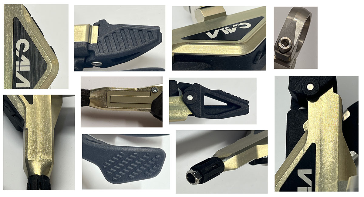 Qua bediening werkt de schakelaar ‘gewoon’ met twee hendels. De onderste, voor het spannen van de kabel, roteert via een scharnierpunt midden op de behuizing, zoals je dat ook gewend bent van andere mechanische schakelaars. De bovenste hendel heeft een kleinere slag en werkt in twee richtingen: met zowel duim als wijsvinger kun je afschakelen naar een kleinere krans. Net als bij de F3-schakelaar biedt Vivo verschillende 3D-geprinte gripstructuren en hendelvarianten om de ergonomie volledig naar wens aan te passen.