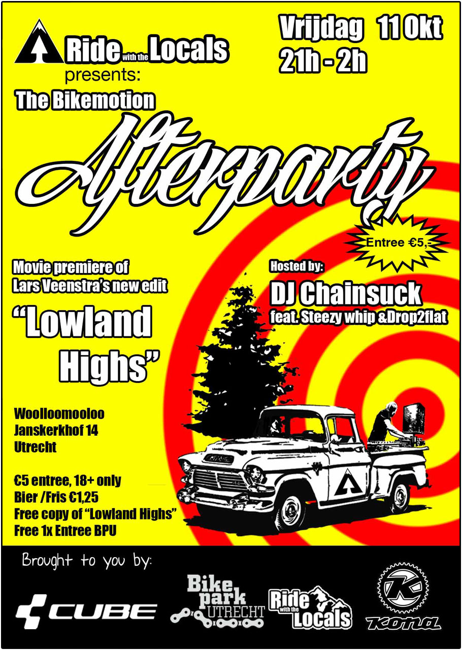 Voor €5,- kom je binnen, inclusief je eigen kopie van “Lowland Highs” op een Cube Bikes USB stick en een singletje Bike Park Utrecht toegang (ook €3,- waard!).