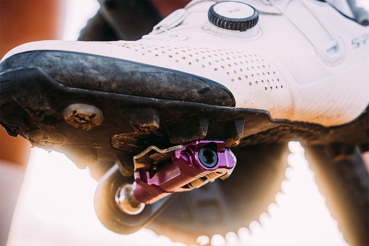 Met de DEL brengt Wolf Tooth z’n lichtste variant, door maar aan één zijde van het pedaal een binding aan te brengen. Ze positioneren dit als een oplossing voor gravelbikers die tot dusver met enkelzijdige racefietspedalen en -schoenen op pad waren, maar die meer zekerheid zoeken in vieze omstandigheden. Zowel qua in- en uitklikken als qua schoeisel met profielzool.