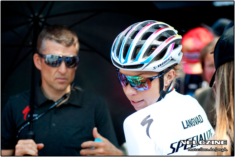 Voor de race stress: Langvad kijkt mee of haar rugnummer wel netjes opgespeld wordt, Sauser geeft ondertussen een laffe thumbs-up.