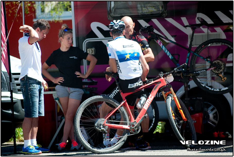 Tja, Pauline (Ferrand Prevot – links), jij wilde met Julien aanpappen… toen wist je zeker nog niet dat ie ontzettend kan ouwehoeren…