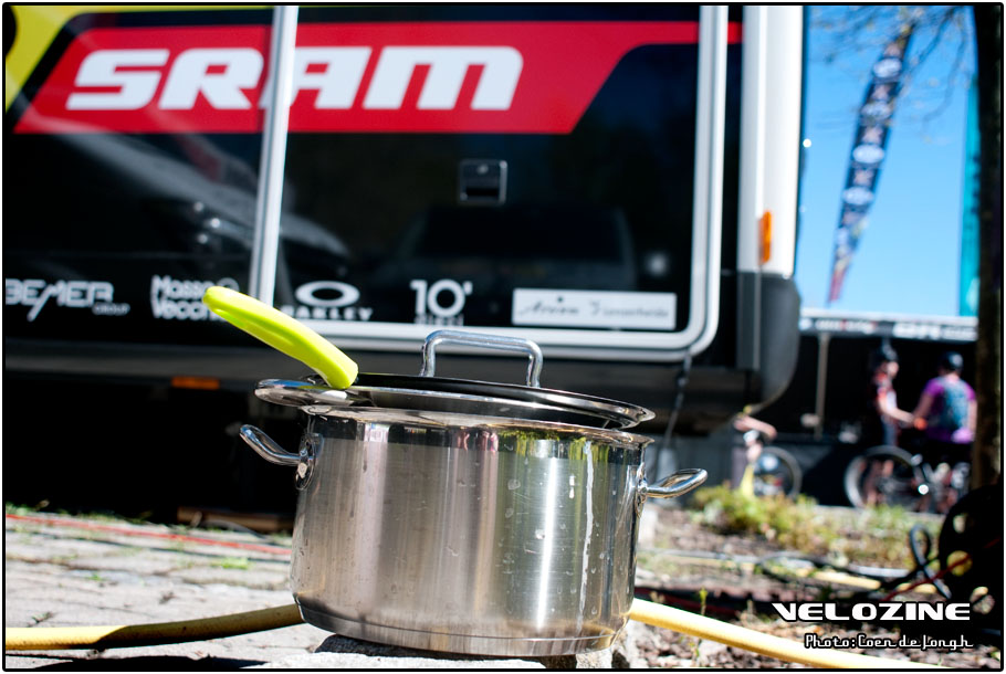 Ondertussen naast de Scott-Sram truck: hier koken ze de kettingen nog gewoon uit! Of de pan staat alvast klaar voor de kaasfondue vanavond, kan ook…